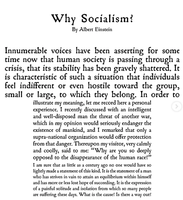 두 차례의 세계대전을 통과한 아인슈타인은 과학자에만 머물지 않았다. 그는 세계를 어떻게 재조직할 것인가를 고민하는 사상가로 이동했다. 그 결론이 사회주의였다. 1949년 그는 미국의 좌파 저널 『먼슬리 리뷰』에 <왜 사회주의인가?>를 기고하며, 자본주의의 무한 경쟁이 개인의 사회적 의식을 마비시킨다고 비판했다. 아인슈타인에게 사회주의는 개인의 창의성을 보장하면서도 사회적 연대를 회복할 수 있는 대안이었다. 그의 물리학이 시공간의 ‘관계’를 강조했듯, 그의 정치는 인간 사이의 ‘관계’를 복원하는 데 초점을 맞춘 셈이다.