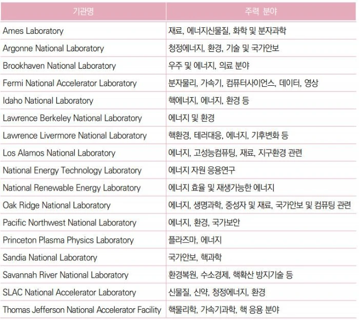 후술하겠지만 이 국립연구소들의 기원은 맨해튼 계획에 있다. 즉 1940년대 핵무기를 개발하고 그 성능을 테스트하려고 만든 비밀 시설들이 국립연구소의 원형이다. 이런 배경 때문에 현재 연구분야도 핵무기 개발에서 파생한 대형·실험 R&D가 주를 이룬다. 물론 핵무기도 여전히 만들고 있기는 하다. 하지만 이보다는 핵을 포함한 넓은 의미의 에너지 활용 연구가 주된 임무라고 할 수 있다. 그 스펙트럼은 기초과학에서 첨단 공학기술까지 망라한다.