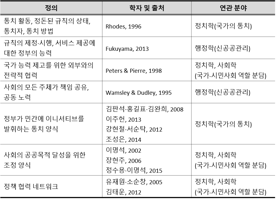 학자들이 사용하는 거버넌스 정의도 다양하다. 정치학에서 거버넌스 이론을 대표하는 R. A. W. 로즈는 현재까지 가장 널리 인용되는 정의를 제시했다. 그는 거버넌스가 통치 활동(또는 과정), 정돈된 규칙의 상태, 통치자, 사회의 통치 방법(혹은 시스템) 등을 의미한다고 한다(Rhodes, 1996). 프랜시스 후쿠야마의 정의도 이와 유사하다. 그는 거버넌스가 규칙을 제정 및 시행하고 서비스를 제공하는 정부의 능력이라고 본다. 이러한 능력은 관료집단의 역량과 자율성의 상호작용에 의해 결정된다(Fukuyama, 2013).