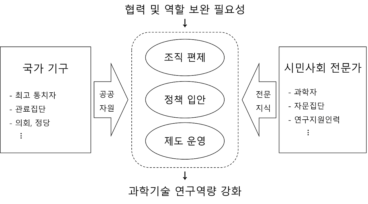 이러한 의미화 작업에 따라, 이 글에서는 과학기술 거버넌스를 ‘과학기술 연구역량 강화를 위한 국가 기구와 시민사회 전문가 간 조직적, 정책적, 제도적 협력 체계’로 규정하고자 한다. 이를 도식화하면 다음과 같다.