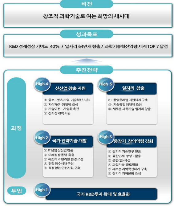 박근혜 정부의 제3차 과학기술기본계획(2013~2018)은 과학기술과 사회·경제 문제를 결합하는 데 중점을 두었다. 이 계획은 High 5·19개 분야·78개 과제를 배치하여 신성장동력 확충을 최우선 과제로 두었다는 점에서 이명박 정부의 2차 계획과 유사했다. 그러나 정책의 강조점을 일부 다르게 찍기도 하였다. R&D 역량 강화에만 집중하지 않고 신산업과 일자리 창출도 비중 있게 다루었다는 점이다. 일례로 2차 계획에는 기술사업화와 창업이 부분적으로 포함되었으나, 3차 계획에는 2개의 독립 추진과제(신산업 창출 지원, 일자리 창출)로 전면화되었다. 그리고 2차 계획의 성과목표는 ‘7대 과학기술강국 실현’으로 다소 추상적이었던 반면, 3차 계획에는 ‘일자리 64만 개 창출’ 목표를 구체적 수치로 확정하였다.