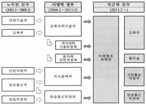 박근혜 정부도 출범을 앞두고 이전 정부들이 그랬듯 조직 개편을 단행했다. 이 작업의 핵심은 과학기술과 정보통신 전담 부처의 신설이었다. 두 가지 고민이 있었다. 이명박 정부에서 교육부-과학기술부 통합, 국가과학기술위원회 축소, 과학기술혁신본부 폐지 등으로 임기 내내 과학기술 홀대론이 끊이지 않았다. 또한 새 정부의 창조경제 비전을 이끌 선도 부처가 필요했다. 그러려면 기초연구, 응용·개발, 기술이전, 창업, 인큐베이팅 등의 총괄 지휘 기능이 갖춰져야 했다. 여기에 방송통신위원회가 담당하던 IT 정책을 규제 중심에서 신산업 정책으로 전환하여 병합하고자 하였다(천세봉, 2017).