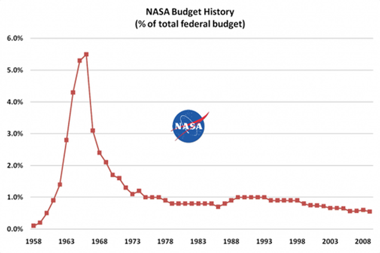 역대 NASA 예산 추이. 설립 직후 아폴로 계획을 추진하던 때가 이들의 리즈 시절이었다.