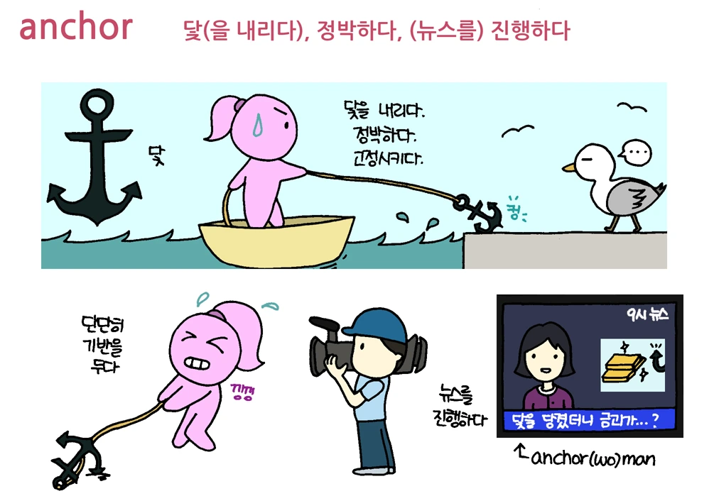 우리가 anchor라는 단어를 접한 건 대부분 '앵커' 혹은 '앵커우먼'이라는 말을 통해서일 거예요. anchor는 기본적으로 배를 육지에 고정시킬 때 사용하는 '닻'이라는 뜻을 가지고 있습니다. '닻'은 한 번 어딘가에 꽂히면 흔들림 없이 자리를 지키고 있기 때문에 비유적으로는 '정신적 지주'라는 의미도 가지고 있지요.