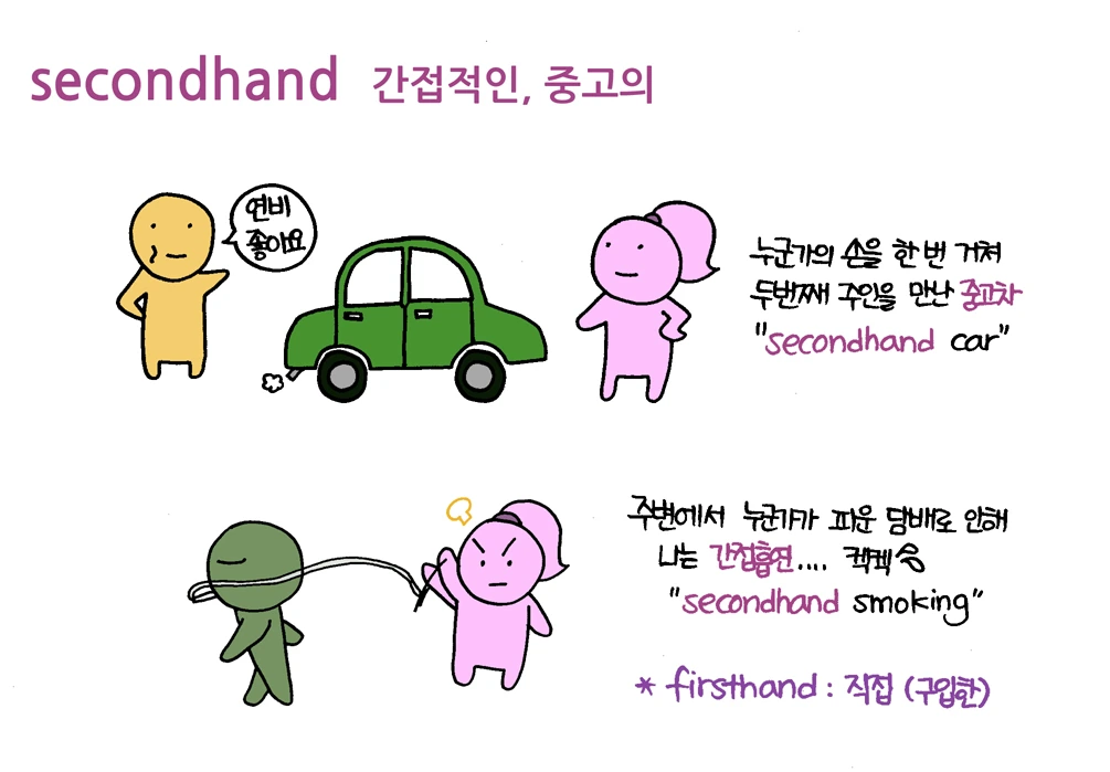 남의 손을 거쳐 내가 두 번째로 손대는 것을 나타내는 단어 secondhand. '간접적인' 또는 '중고의, 중고로 구입한'이라는 뜻을 가지고 있습니다. 알x딘과 같은 중고서점을 secondhand bookstore라고 하며, 위의 그림처럼 중고차를 secondhand car라고 표현하시면 됩니다.
