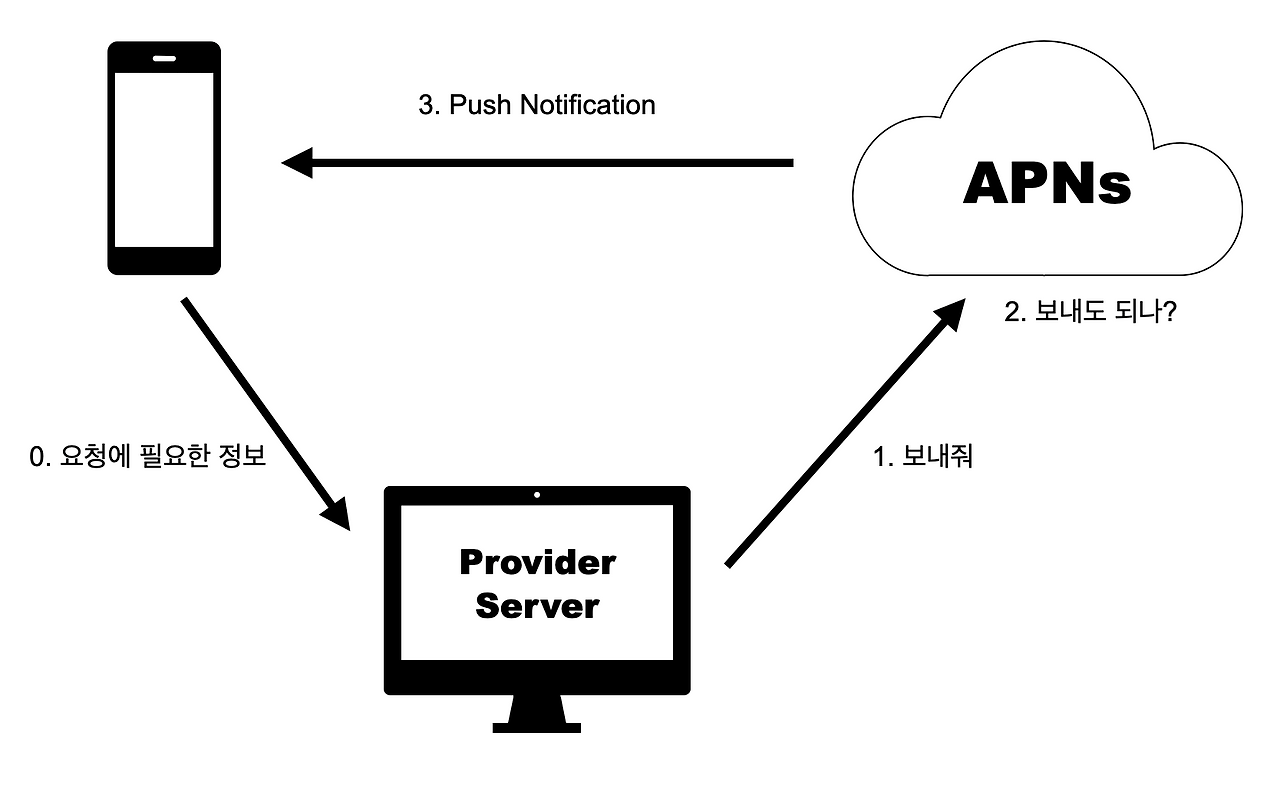 이 요청 또한 정해진 규격에 맞게 APNs와 연결한 후에 가능하고, 이를 위해 APNs에게 요청해줄 저희의 서버가 필요합니다.