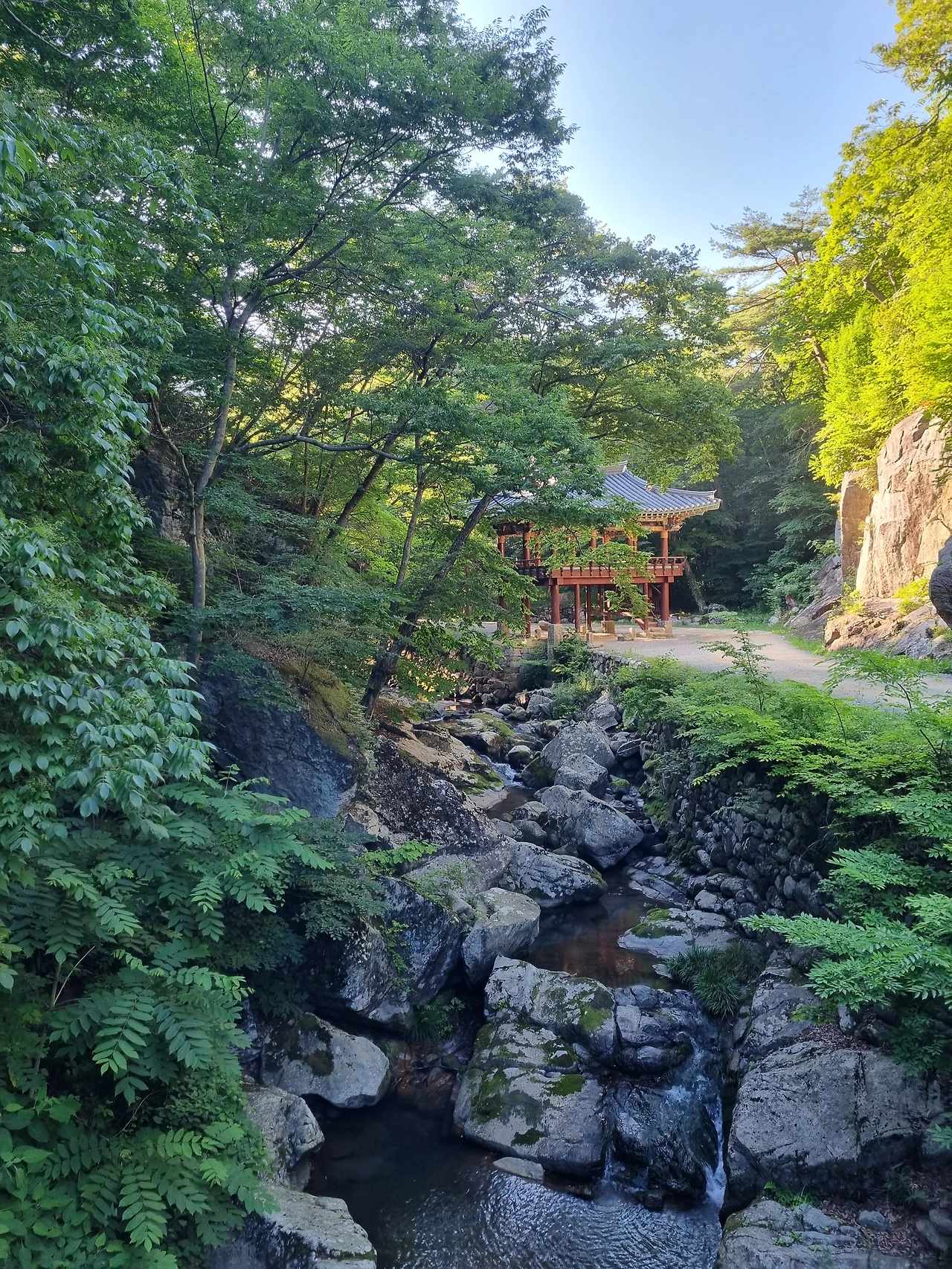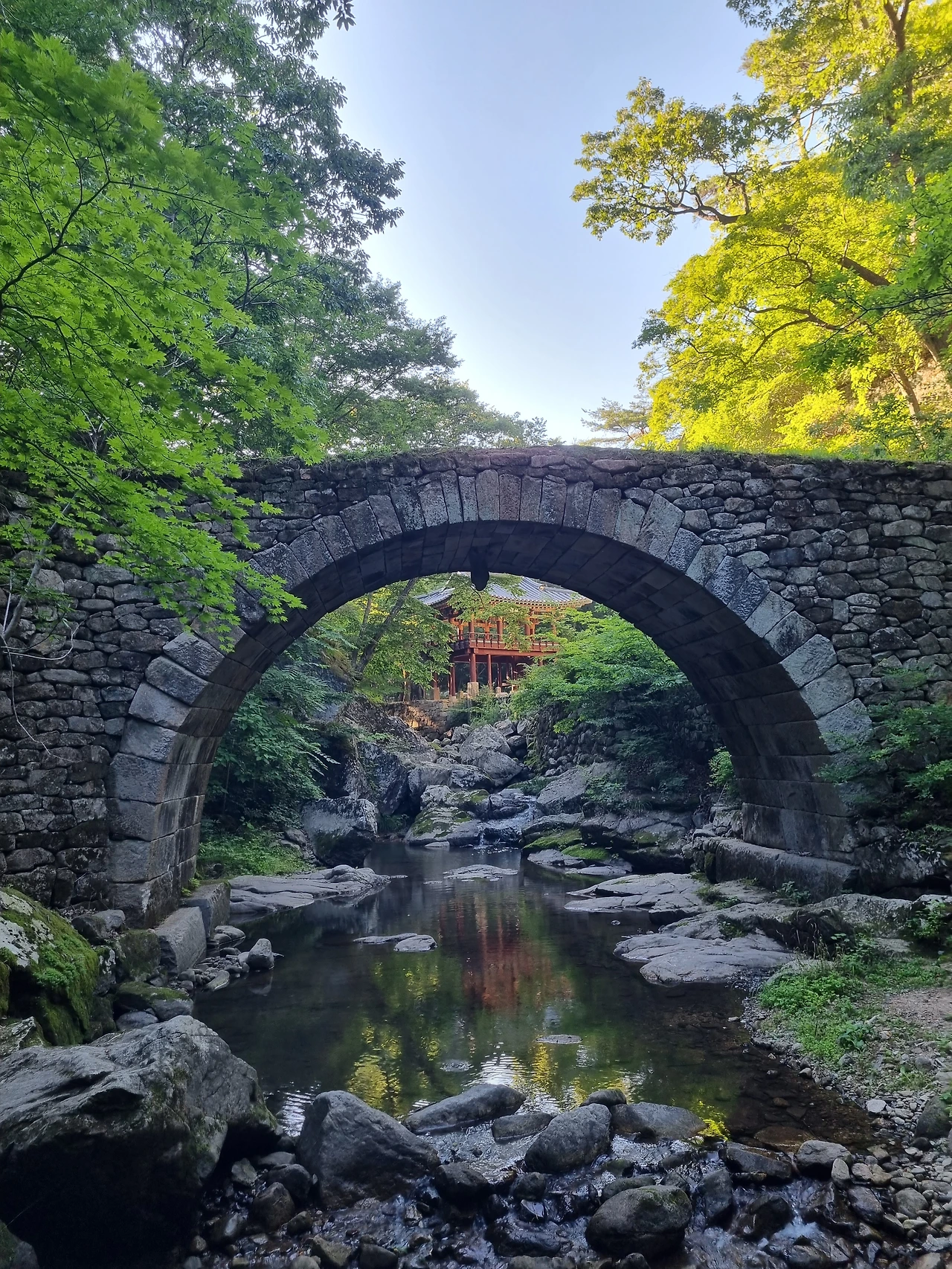 차를 마신 후 숙소인 심검당으로 돌아가기 전에 승선교 아래로 내려가 얼음물처럼 차가운 계곡물에 발을 담그고 더위를 식혔다. 흐르는 물소리는 ASMR 그 자체였다. 여유로움이 주는 행복에 기분이 좋아진 우리는 휴대폰 스피커로 작게 음악을 틀고 흥얼거렸다. 정말이지, 발길 닿는 모든 곳과 모든 순간이 힐링이었다.