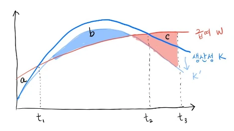 아래 그래프를 보면, 생산성이 낮아지면서 t2는 앞으로 당겨졌고, b는 작아지고 c는 커진다. 회사에서는 더 이상 c그룹의 직원들을 돌볼 여력이 사라진다.