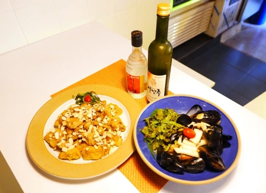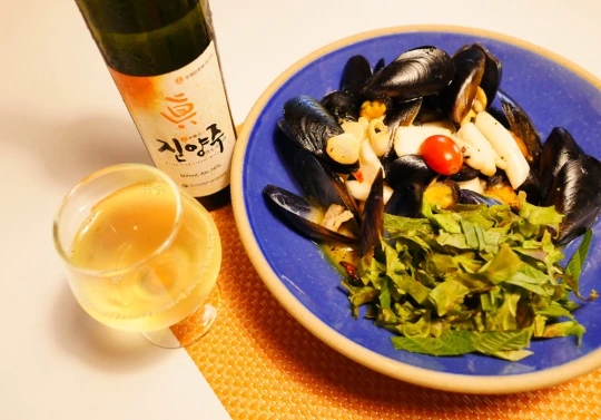 입가심은 '해물떡 알리오 에 올리오'. 각종 해물과 떡에 마늘과 올리브 오일을 곁들인 이탈리아 요리이다. 향이나 맛이 강한 재료를 사용하지 않기 때문에 담백하고, 부담이 없는 편. 묵직하니 길게 여운을 남기는 진양주와 밸런스가 제대로다. 아무튼 나는 진양주에 취향 저격. 탕탕. 부드러운 단맛 덕분에 술을 잘 못하거나, 가볍게 취하고 싶은 여자들에게 추천할만하다.