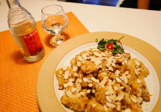 이강주에는 돼지고기를 쫀득하게 튀겨낸 '꿔바로우'를 준비했다. 특히 박 언니가 유난히 좋아했던 메뉴 구성인데, 박 언니에 따르면 이강주는 돼지고기랑 먹어야 제대로 마시는 거란다. 옳은의 꿔바로우는 달콤한 소스에 고소한 아몬드 슬라이스가 듬뿍. 게다가 쫀득하고 바삭바삭한 식감이다. 분명 맛은 있지만 계속해서 먹기엔 조금 물릴 수도 있는데, 이때 이강주로 말끔하게 싹~ 궁합이 예술이다.