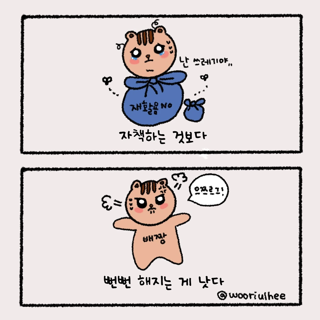 누가 나를 탓하거나 부정적인 결과가 나오면 스스로를 옭아매며 자책하고 괴롭혔다. 내 잘못이 아닌 일에도 움츠러들며 쓰레기라고 생각했다. 과거의 나는 작고 쉽게 흔들렸다. 자책한다고 시간을 돌릴 수 있을까? 없다. 나를 위해 차라리 뻔뻔해지는 게 낫다.