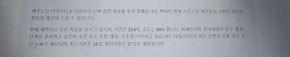 첫 질문' 17일부터 21일까지 제주도 날씨를 알고 싶어'에 대한 답이다.