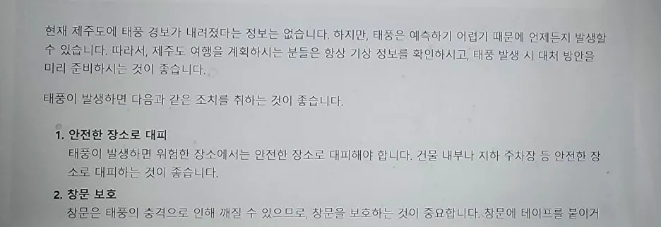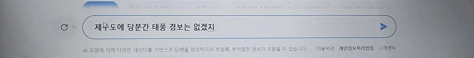 제주도 날씨에 대한 정보가 더 필요해서 태풍에 대한 질문을 해보았다. 아직은 태풍 경보가 없다니 다행이다