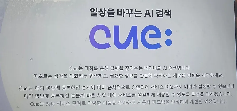 새로운 AI 검색 서비스를 소개합니다. 네이버의 풍부한 데이터와 고도화된 AI 기술이 만나, 나에게 꼭 필요한 정보를 대화로 찾아 나갈 수 있는 Cue:를 소개합니다. 동영상 새로운 네이버 AI 검색 Cue: 네이버 검색은 사용자에게 최상의 답변을 제공하기 위해 끊임없이 도전을 해왔습니다. 그리고 이제 네이버의 AI 기술이 집약된 Cue:를 통해 새로운 검색 경험을 선보이고자 합니다. 첫 번째, 어떤 검색어로 입력해야 할지 고민하지 말고 사람에게 물어보듯이 자연스럽게 질문하세요. Cue:가 질문을 이해하고 원하는 정보를 검색해서 가...
