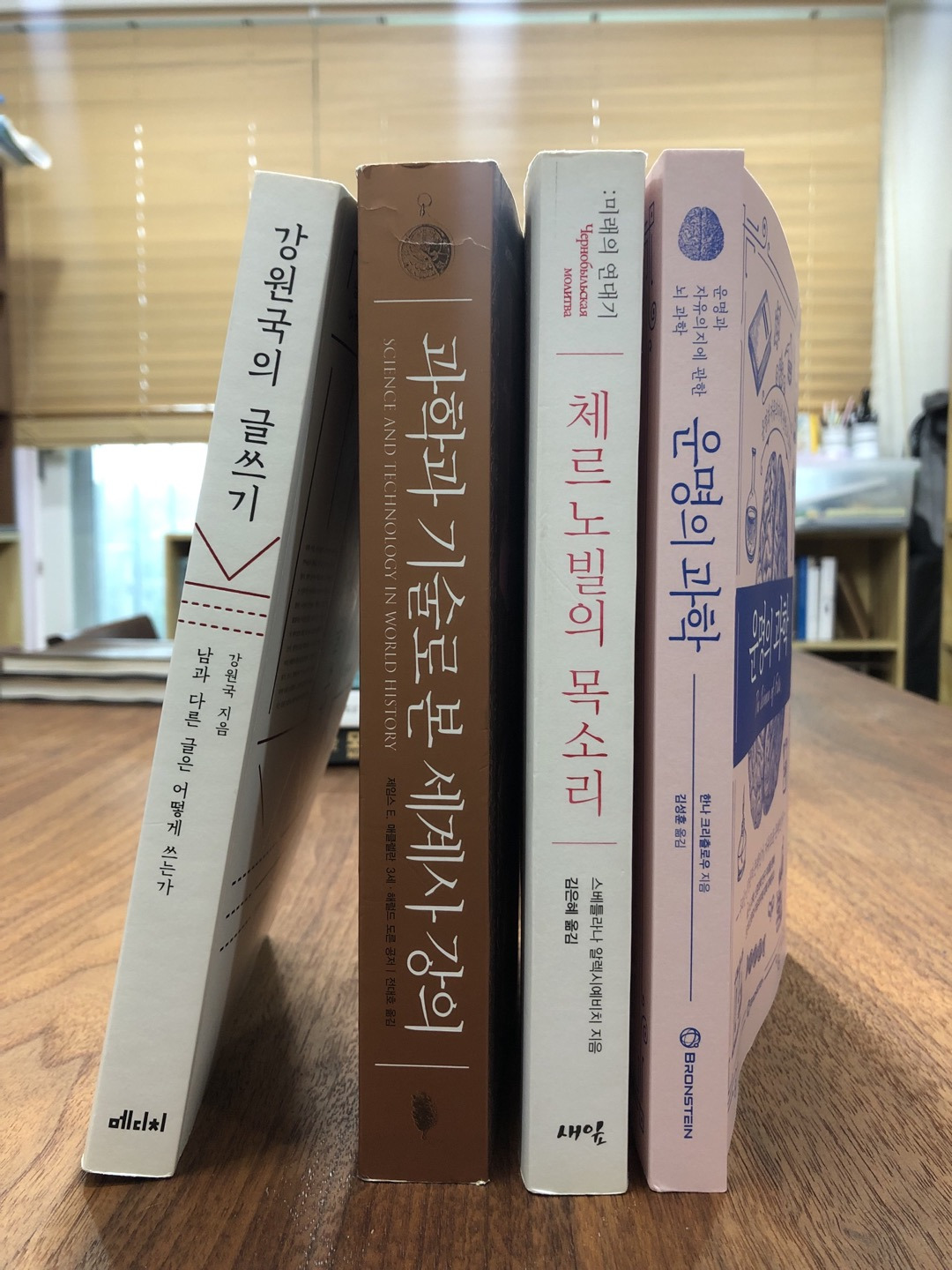 '책으로1040' 첫 모임은 2월 12일이었다. 같이 읽은 책은 <강원국의 글쓰기>였고, 우리는 '잘 산다'는 것에 대해 '지식'과 '지성' 그리고 '지혜'의 차이에 대해 이야기했다. 두 번째 책은 매클렌란 등이 쓴 <과학과 기술로 본 세계사 강의>였고, 찰스 다윈이 연구를 했던 방법과 우리를 감싸고 있는 불안에 대해 말했다. 세 번째 책은 알렉시예비치의 <체르노빌의 목소리>였고, 망해가는 조직에 대해 책을 읽는 방법에 대해 생각해봤다. 상반기 마지막 책은 크리츨로우의 <운명의 과학>이었고, 우리는 '기본기'에 대해 '말하는 방법'에 대해 이야기했다. '책으로1040'은 '과학'에 속한 도서들을 주로 읽었고, 우리는 모임의 정체성을 차츰차츰 찾아가는 중이다.