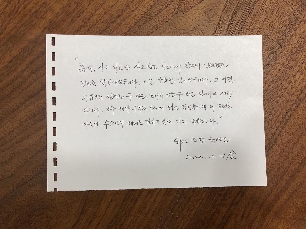 SPC 그룹 회장이라는 자는 참사 발생 6일 만에 대국민 사과문을 발표했다. 발표 시기도 놓쳤고 발표 내용도 놓쳤다. 사고는 당일 새벽에 발생했다. 그날 오후에라도 사과문이 나왔어야 했다. 그날 참사의 진상을 파악한 후, 늦더라도 다음 날에는 대책을 마련한 기자회견이 있었어야 했다. 다시 봐도 기본이 안 된 회사이다.