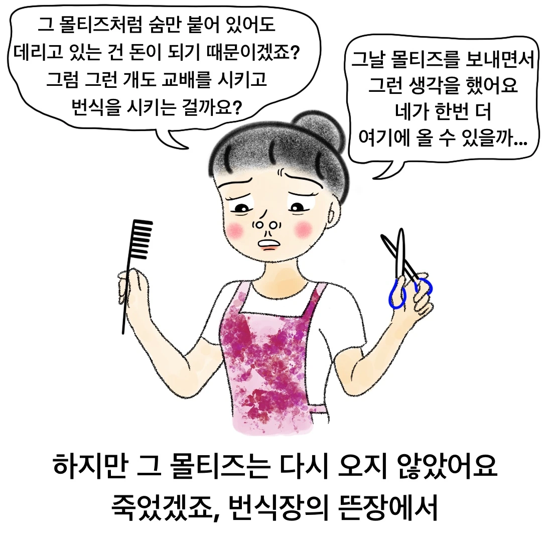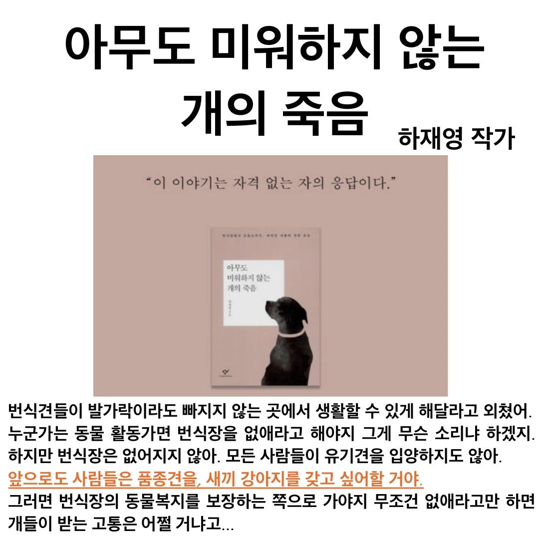 하지만 그렇기 때문에 꼭 좀 읽어보라고 권했어요. 동물을 좋아하는 사람조차 불편한 감정과 연민 때문에 관심을 더 가지지 않는다면, 오히려 외면한다면 누가 동물을 위해 목소리를 내겠어요.
