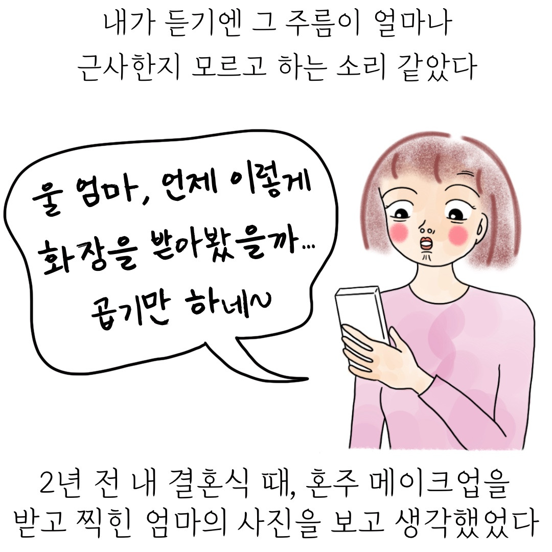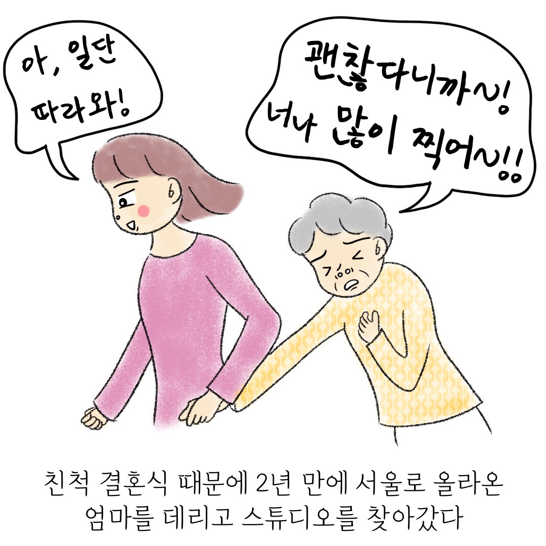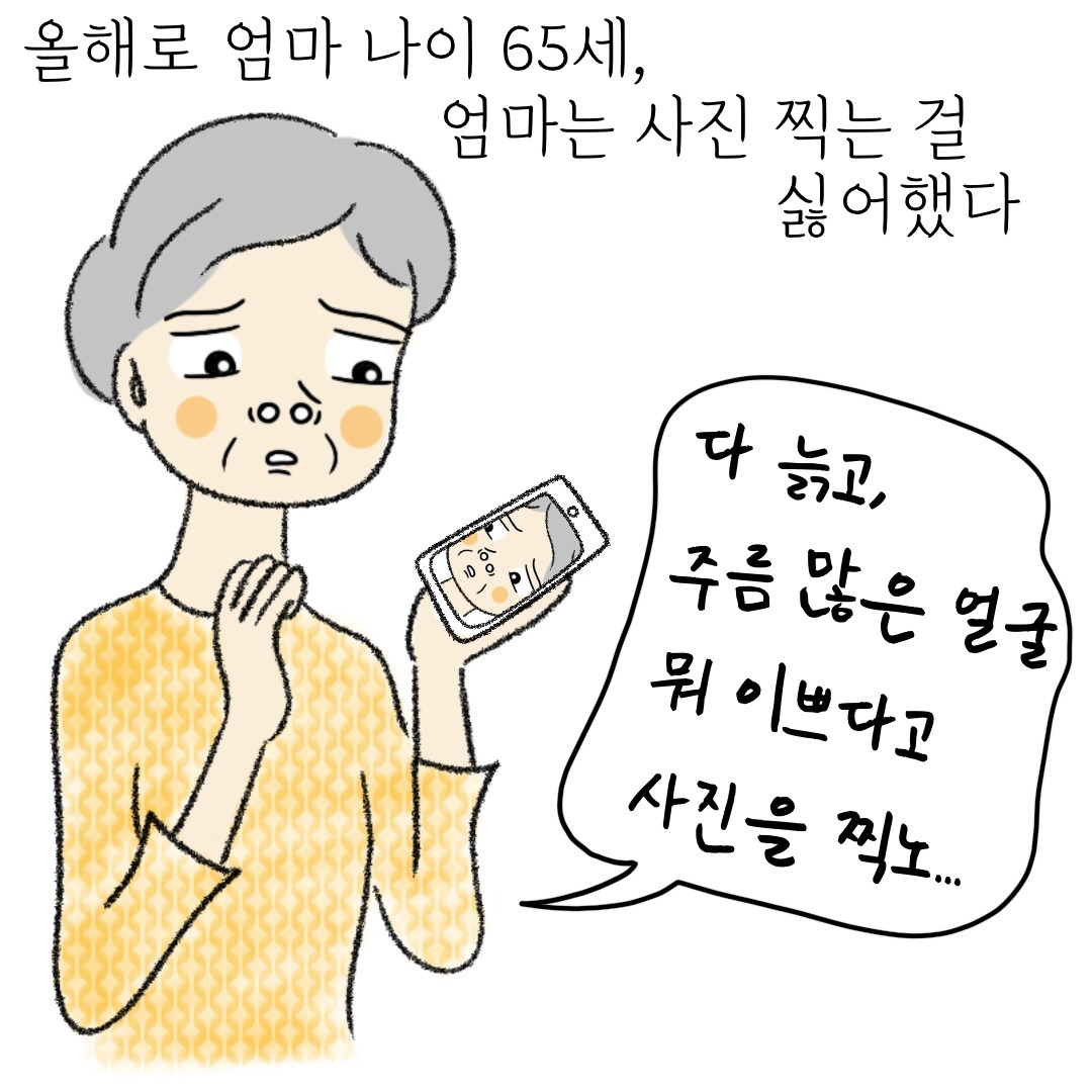 독자님들은 엄마에게 어떤 나날을 선물하고 계시나요? 오래된 가족 사진은 잠시 한쪽으로 치워두고 근사한 프로필 사진 한 장 찍어드리는 건 어떠세요. 내 부모의 생각지도 못했던 표정을 만나실 수도 있다고요.