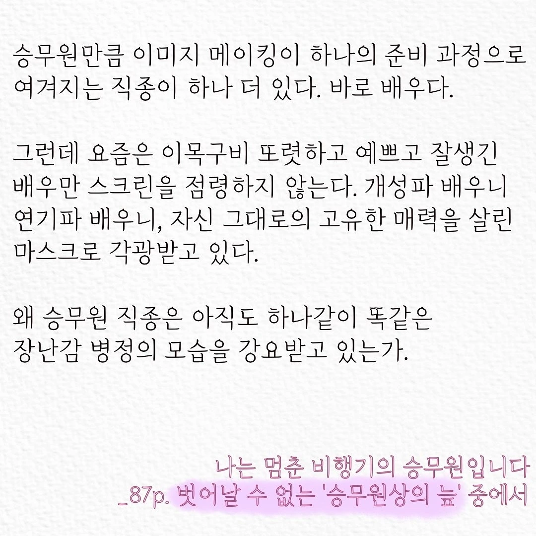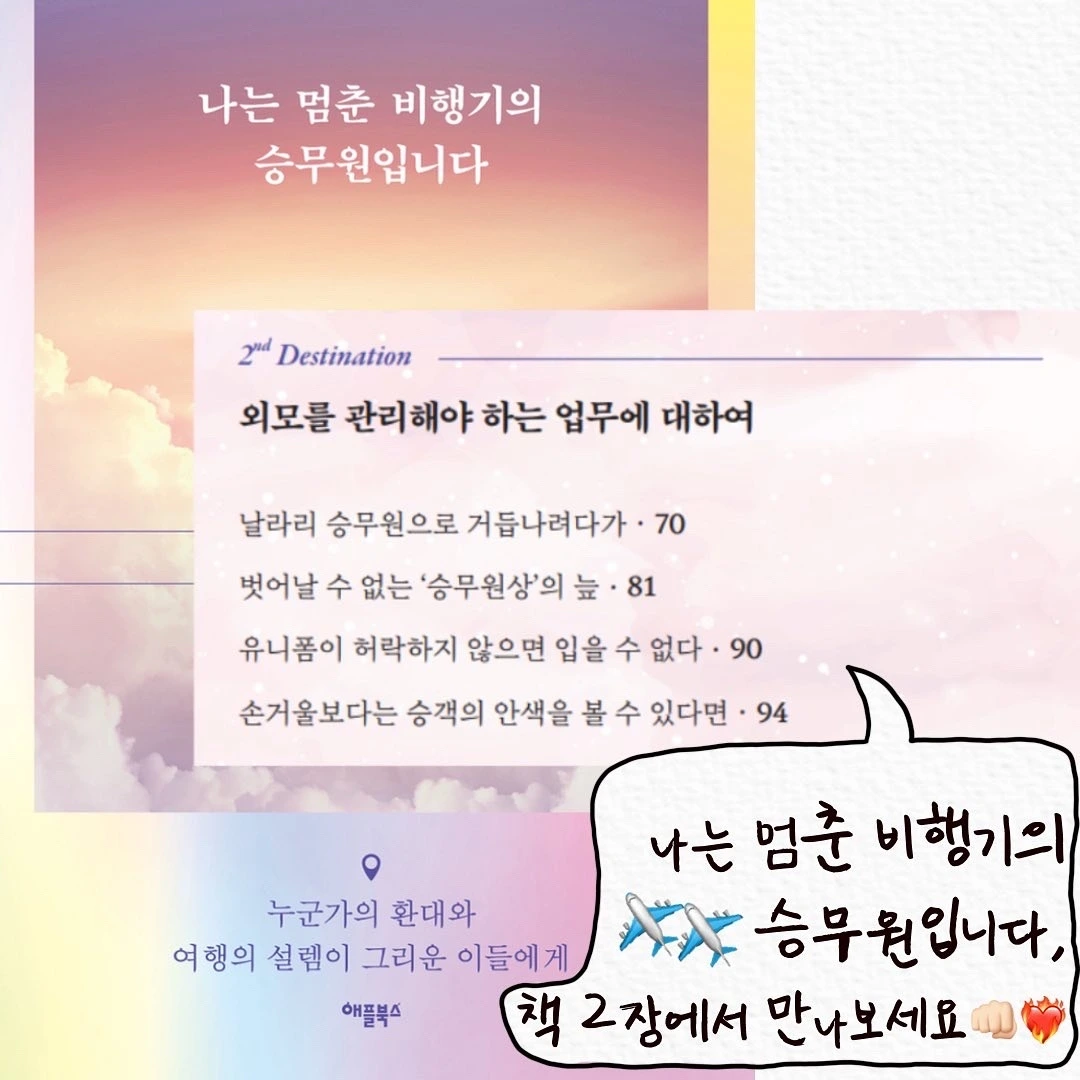 책 2장 「외모를 관리해야 하는 업무에 대하여」는 제가 이번 책을 위해 모두 새로 쓴 글입니다. 예민할 수도 있는 부분이지만 승무원으로 오랜 시간 비행하며 꼭 한번 이야기하고 싶었던 주제예요.
