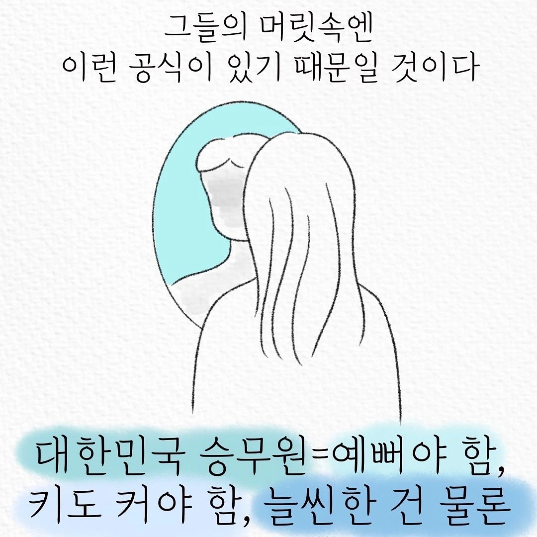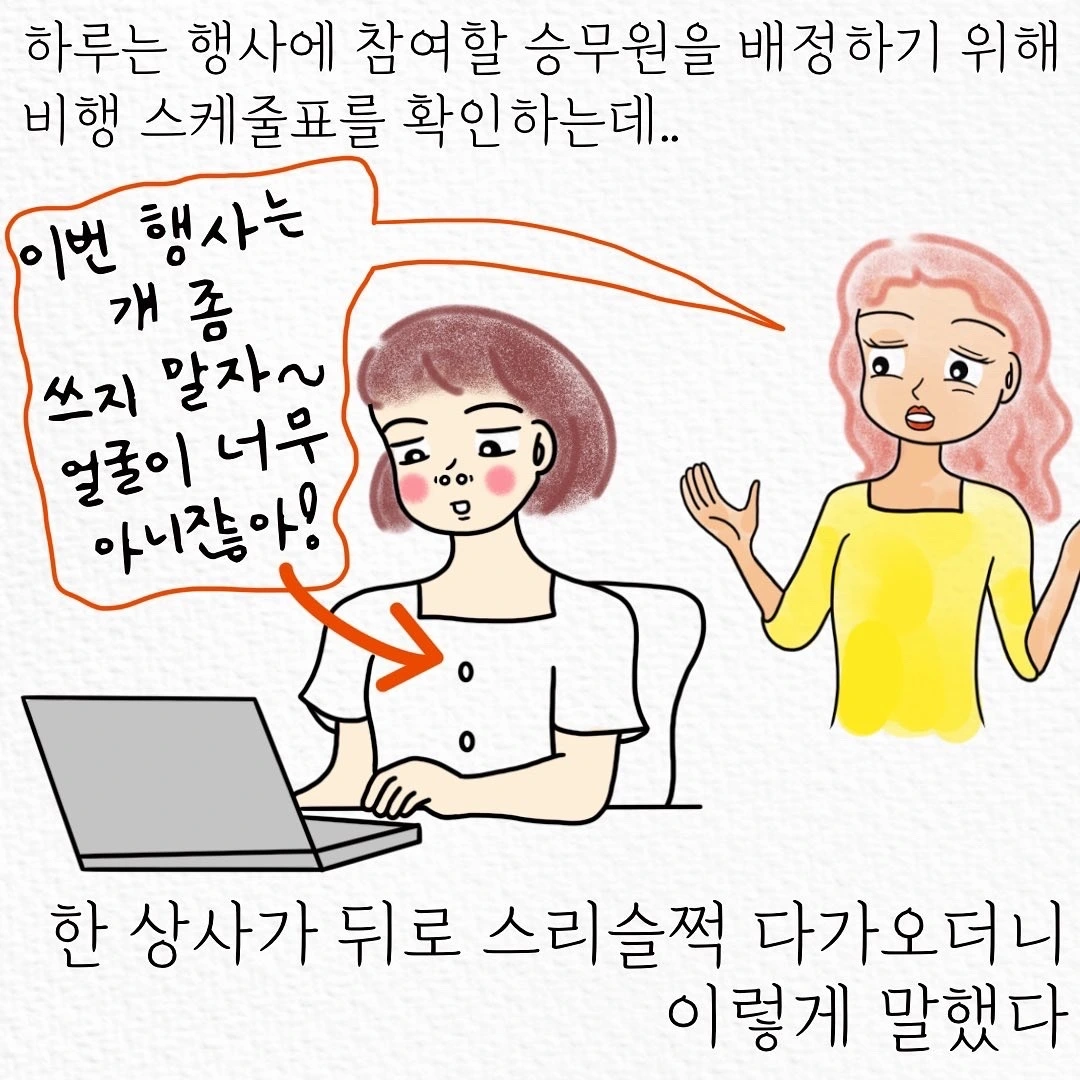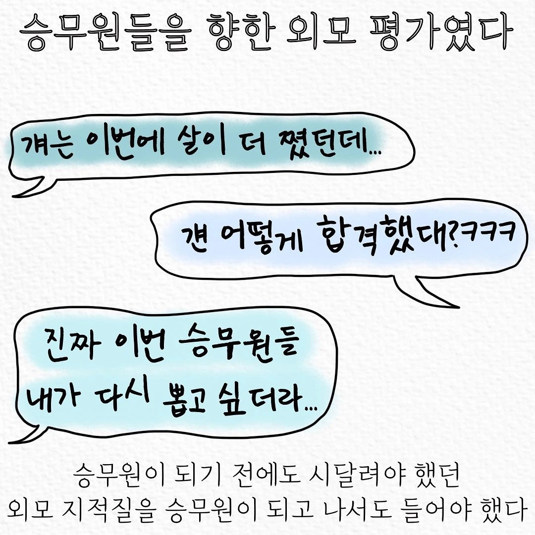 승무원 웹툰을 그리면서 DM을 정말 많이 받았어요. "제가 키가 작은데 될까요?", "제가 좀 통통한데 승무원은 꼭 말라야만 하나요?", "승무원 중에 사각턱, 웃을 때 투턱은 없죠?", "피부 하얗고 좋아야 하죠?"