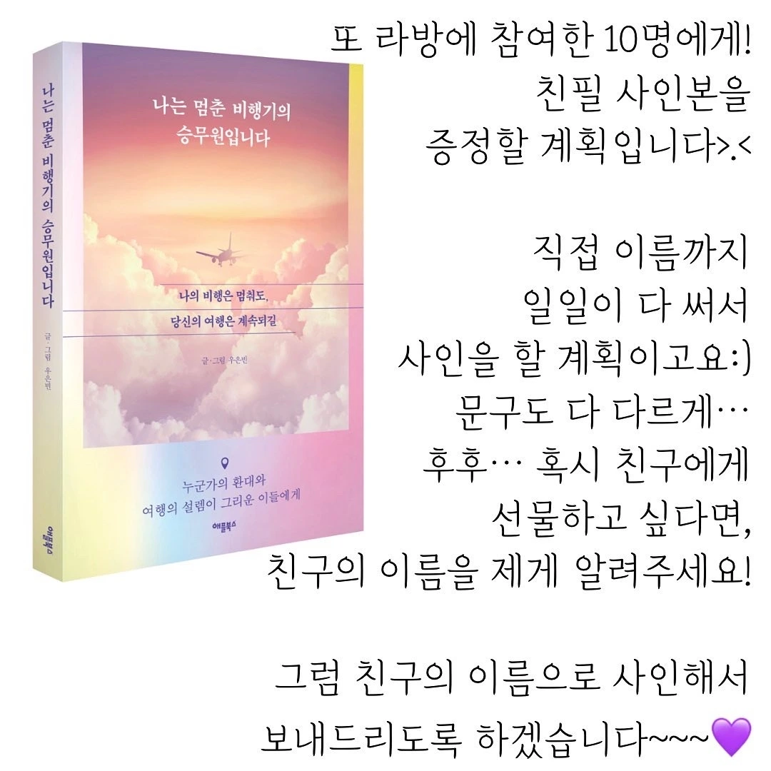 그리고 저희가 라방에 참여하신 분들 중 총 10분을 추첨해서 친필 사인본까지 보내드릴 거니까요...(애플북스 출판사가 쏜다!) 이름도 제가 한 분씩 다 써드릴 겁니다..! 혹시 친구에게 선물하실 거면 친구 이름을 말해주세요~ 그럼 제가 또 친구 이름을 고이 마음을 담아 써서 보내드리도록 하겠습니다. 이 정도면 진짜 풍성하게, 풍만한 구성으로! 돌아온 거 맞죠?!?