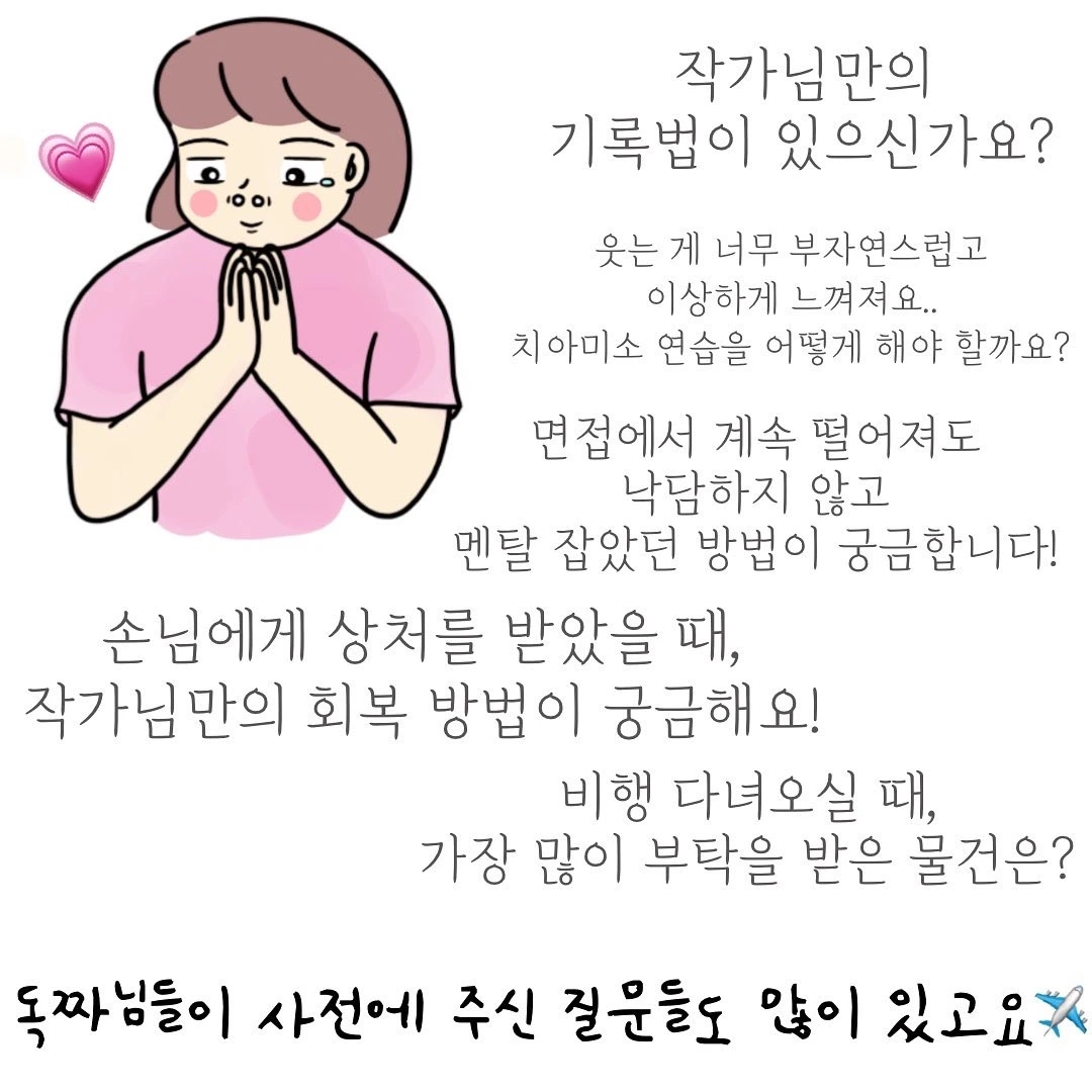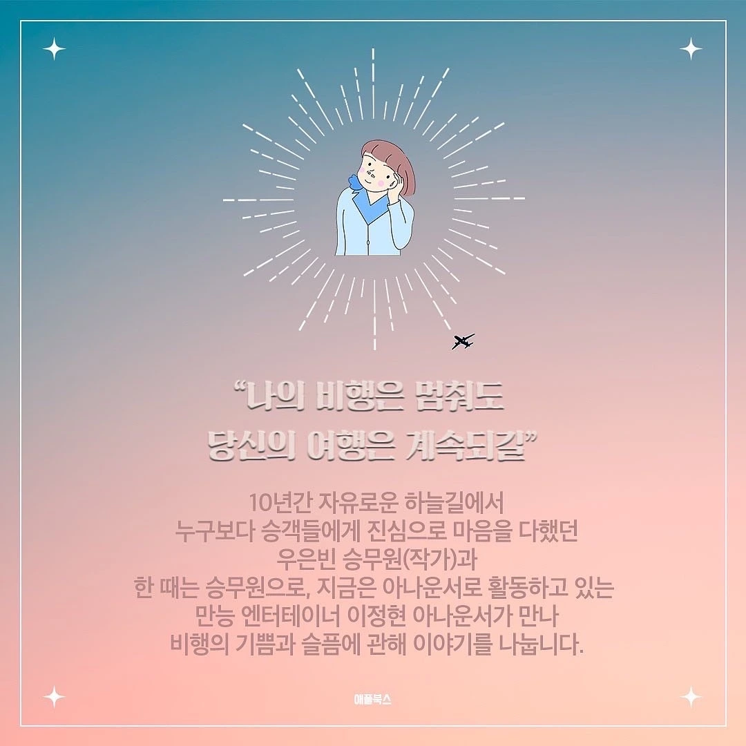 진행은 저의 ANA항공사 동기이자 친구인 이정현 아나운서가 맡게 되었어요(진행이라고 하니 너무 거창한 느낌...? 그냥 저희 수다나 떨 텐데...ㅎ). 이 친구는 저와 함께 비행을 하다 돌연 그만두더니!!! 아나운서로 뿅하고 나타난 친구예요. 물론 그 과정은 힘들었겠지만... 덕분에 내공으로 똘똘 뭉친 현직 아나운서인 친구가 함께하니, 여러분이 많이 어려워하는 스피치나 발성, 발음 팁에 대해서도 물어보면 좋을 것 같아요.