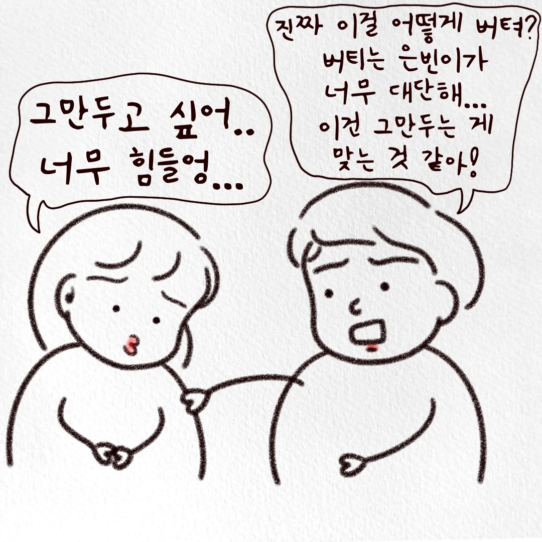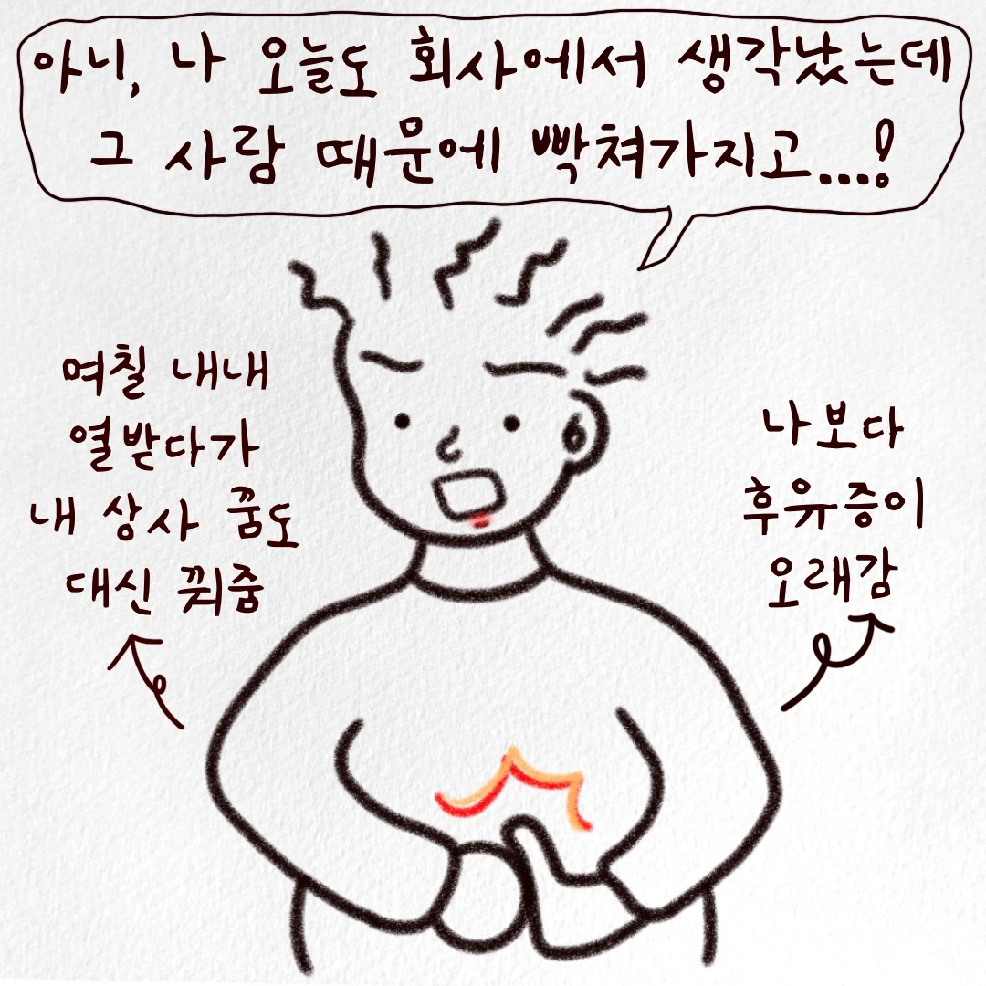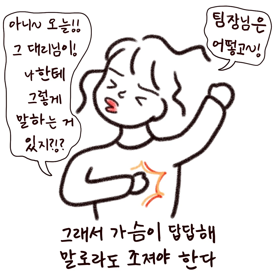 저는 당황해서 어버버... 하다가 타이밍을 놓쳐 아무 말도 하지 못하고 그냥 퇴근할 때가 많았어요. 그럼 가슴속에 응어리가 진 것처럼 답답해져 집에 와서 뚱목이에게 와다다 털어놓았죠.
