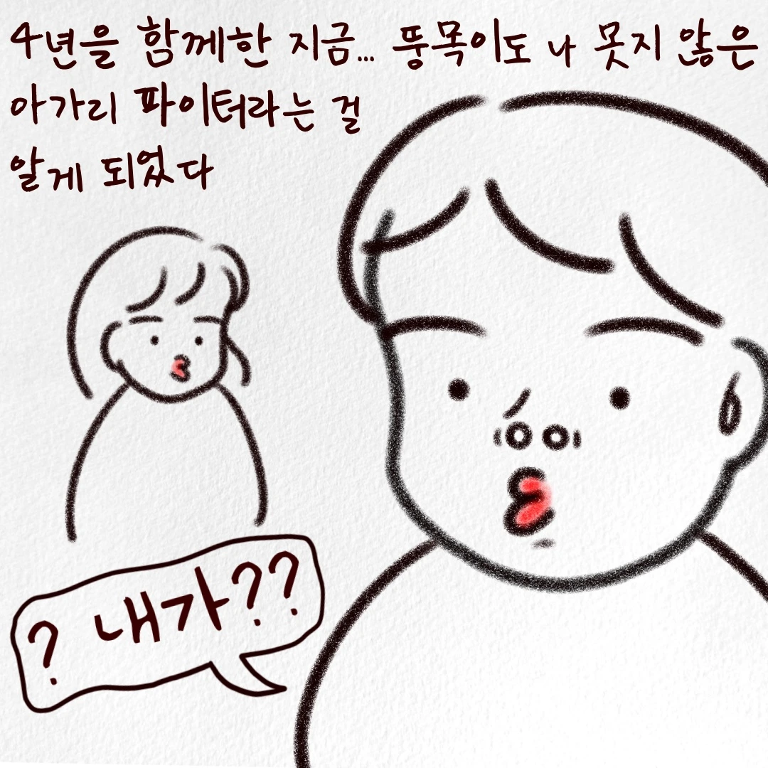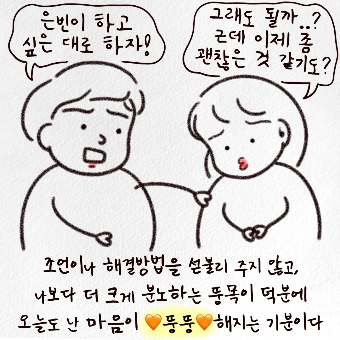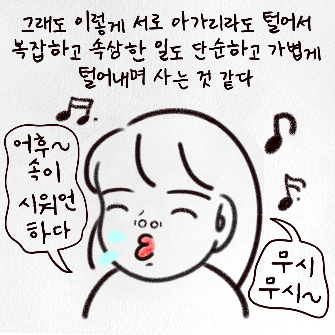 그렇다고 진짜로 제가 동료 또는 상사에게 혹은 고객에게 크게 들이받을 수 있는 성질도 아니고요. 당장 일을 때려치울 사람도 아니거든요. 뚱목이도 그걸 아니까 말로라도 제가 답답함을 풀 수 있는 상황을 가정해 주었던 거겠죠. 그렇게 집에서 서로 아가리 파이터가 되어 한바탕 풀고 나면 다음날 다시 멀쩡하게 출근할 수 있는, 홀가분한 마음이 되었어요. 앞으로도 저희 부부는 아가리 파이터로 살아가지 않을까 싶어요:)