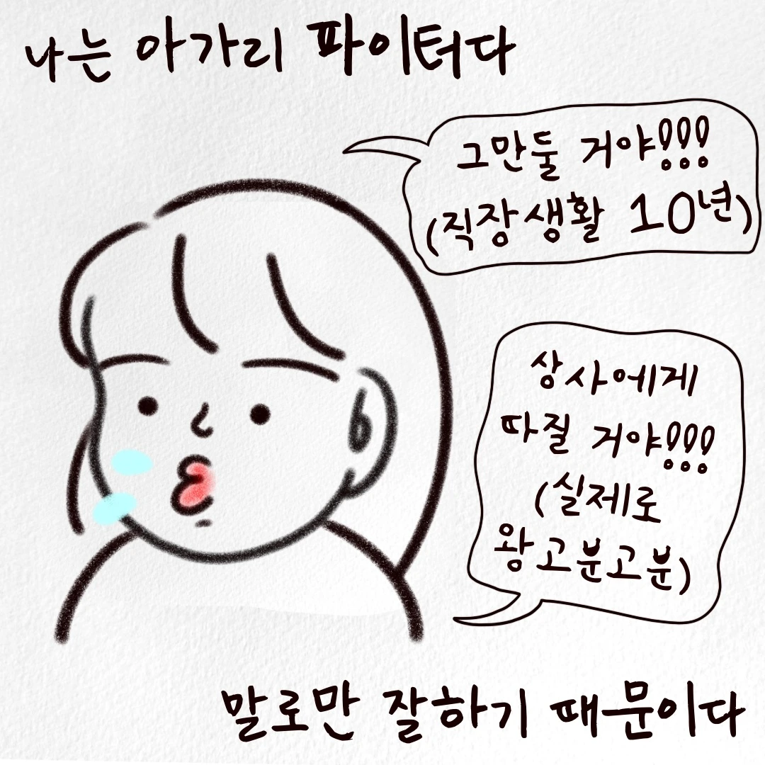 아가리 파이터로 살아가는 우리 직장인 독자님들! 가슴에 응어리만 지지 않게 그때 그때 풀면서, 아가리로 싸우고 맛있는 거 먹고! 다시 출근이나 하자고요♡
