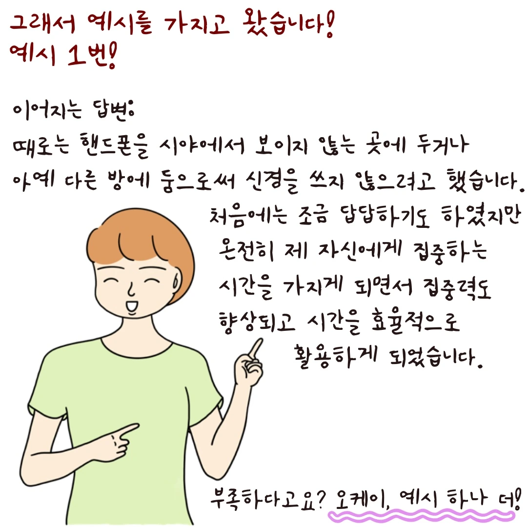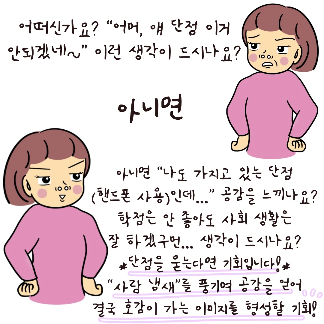 제가 예시로 든 핸드폰 사용! 이거 솔직히 다들 그러지 않나요?>.< 저도 어제 밤에 1시간 내내 쇼츠 보다가 현타 오지게 맞았거든요... 근데 왜 자꾸 지나친 꼼꼼함, 지나친 책임감, 지나친 배려심 등등! 단점을 지나치게 포장하려고 하시나요