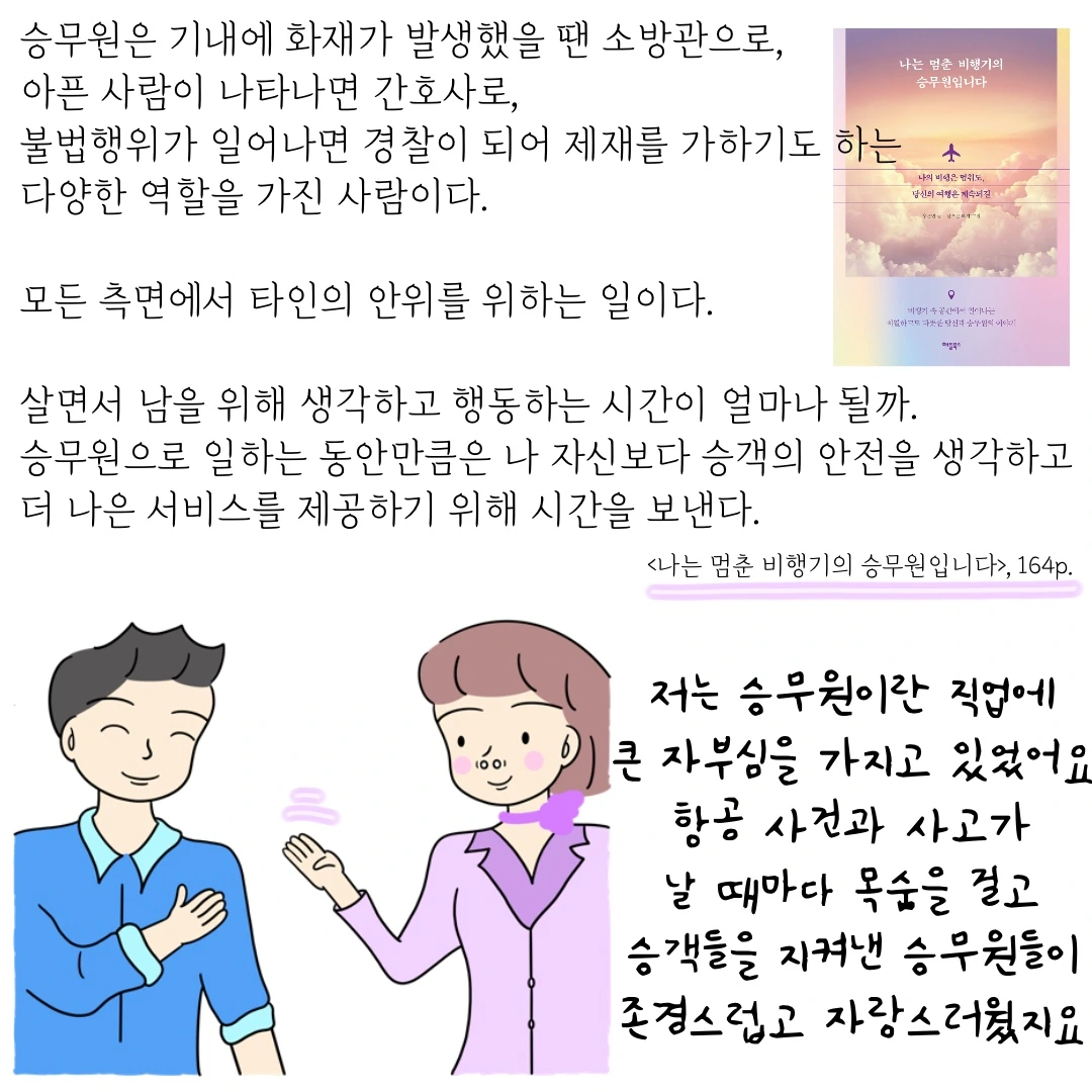 "남을 배려하고 도울 수 있는 직업이잖아. 게다가 승객 안전을 위한 일은 물론, 때로는 생명까지 책임지기도 하잖니. 예전에 샌프란시스코 공항에서 사고 났을 때 그 항공사 승무원들 보렴. 부상당한 승객을 업고 뛰면서 탈출을 도왔잖아. 비행기에 마지막으로 남은 단 한 명의 승객까지 확인하고 책임지는 그 모습이 세계인에게 감동을 준 거야. 아마도 그 승무원들은 위기 상황에서 침착하게 승객을 먼저 생각해야 한다는... 그런 생각을 항상 하면서 비행에 임했을 거야. 그러면 진짜로 남을 도와야 할 상황과 맞닥뜨렸을 때, 생각하기도 전에 몸이 먼저 움직이거든.