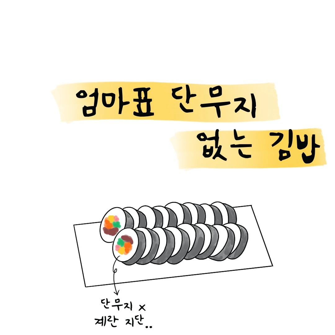오, 굳이 단무지를 빼서 먹는다고 타박 받던 내게는 참으로 반가운 장면이었다. 나는 단무지의 형광색도 싫어하지만 새큼새큼한 맛은 더 못 견뎌한다. 그래서 짜장면 먹을 때도 단무지가 아닌 김치를 꺼내 먹는다. 엄마는 오로지 그렇게 까탈스러운 나를 위해 단무지 없는 김밥 도시락을 싸게 되었다.