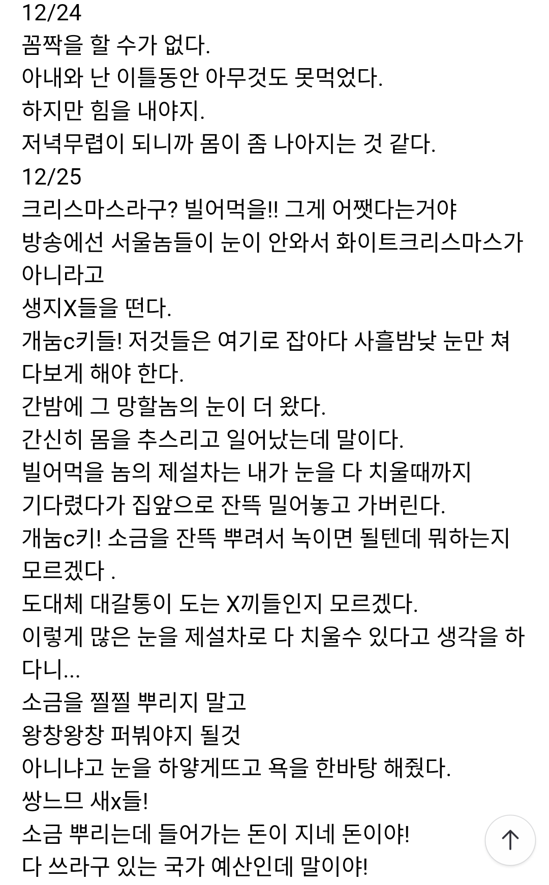 눈삽으로 눈을 최소 1톤정도 치우고 근육통과 몸살이나서 거의 기절했다가 지인오기전에 방을 치워야해서 급기야 곧 일어나 7만원주고 아는 또다른 지인분께 등마사지를 받고왔다. 얼마나 피곤했는지 마사지 받다가 잠들어버려서 지인이 끝났다고 깨워줘서야 일어났다.