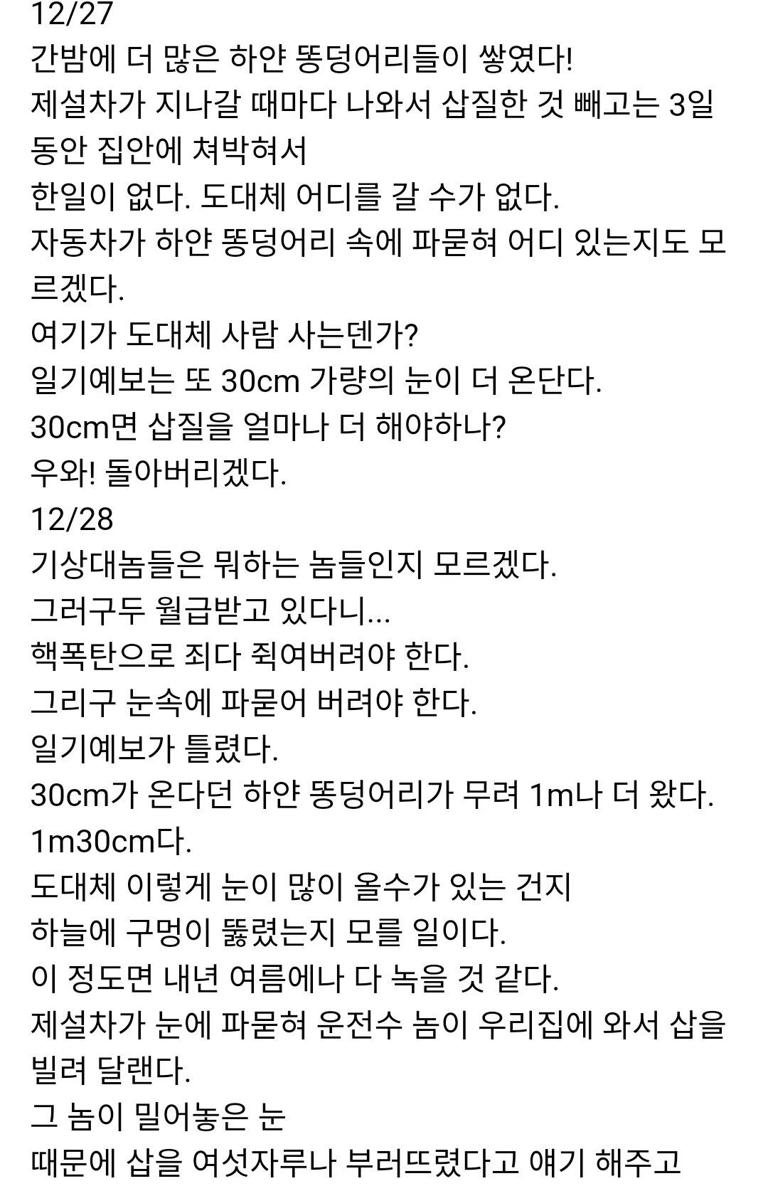 마당에서 눈을 최소 1톤정도 퍼냈다. 서울같은 도시에 사는 사람들은 이말이 이해가 안갈것이다. 하지만 우리 강원도 원주민들에겐 겨울의 일상이다. 인터넷에 떠도는 '부산 사나이의 강원도 이사일기'를 보면 강원도의 겨울이 어떠한지 어느정도 이해할수 있다.