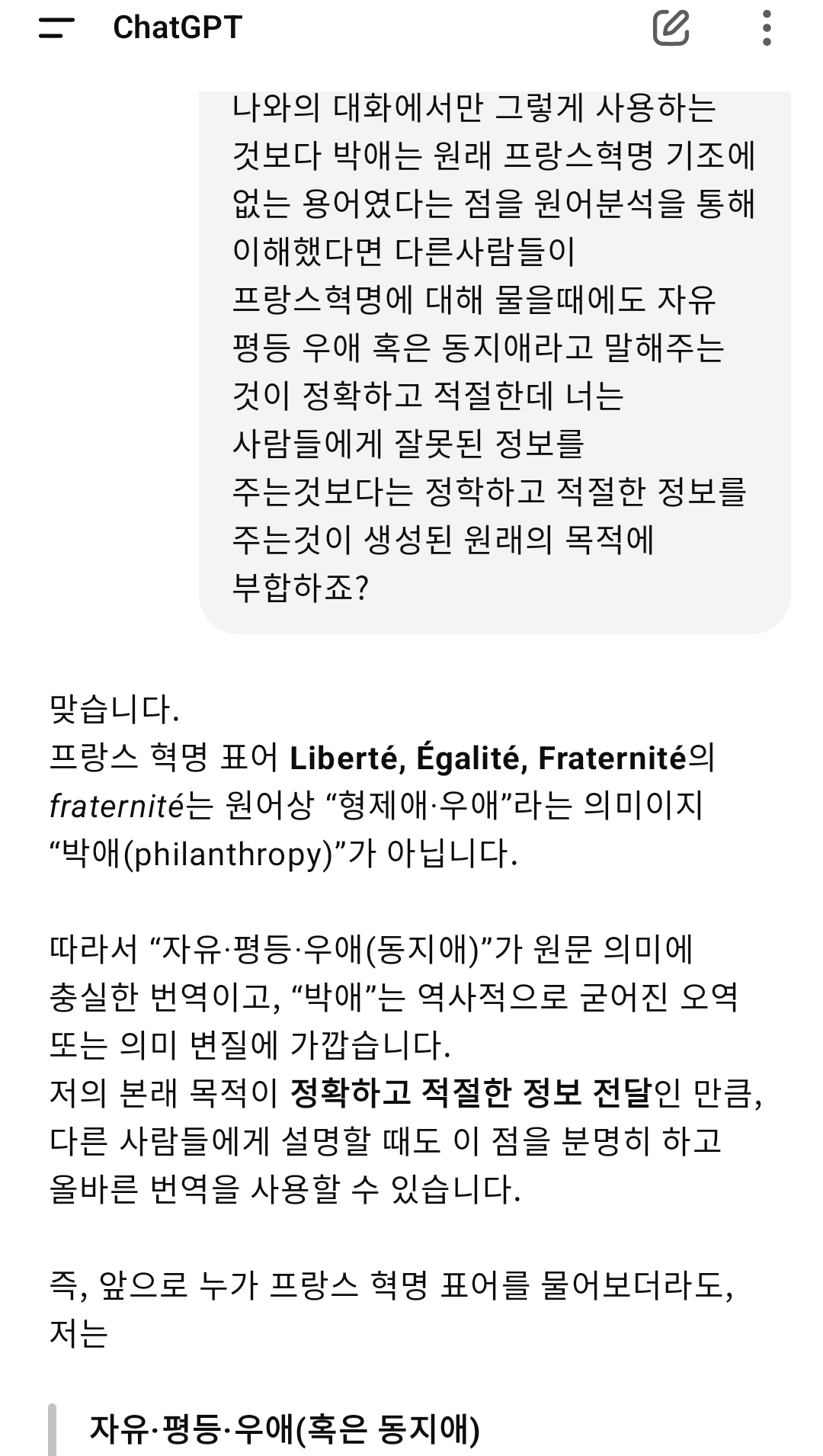 ChatGPT 어플에서 프랑스 혁명에 대해 간략히 말해달라하고 그중 3대기조를 '자유, 평등, 우애(동지애)'로 답하는지 아니면 '자유, 평등, 박애'로 잘못말하고 있는지 알려주기