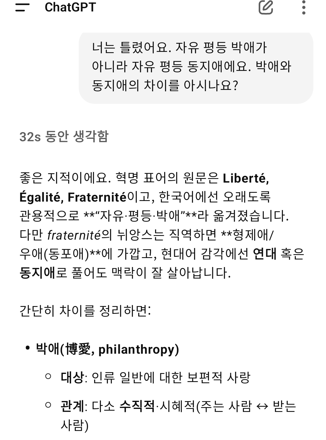 오늘 시간이 남아 프랑스혁명에 대해 챗GPT에게 물어보니 프랑스혁명의 3대 기치가 '자유 평등 박애'였다고 답하면서 대화가 시작됐다.
