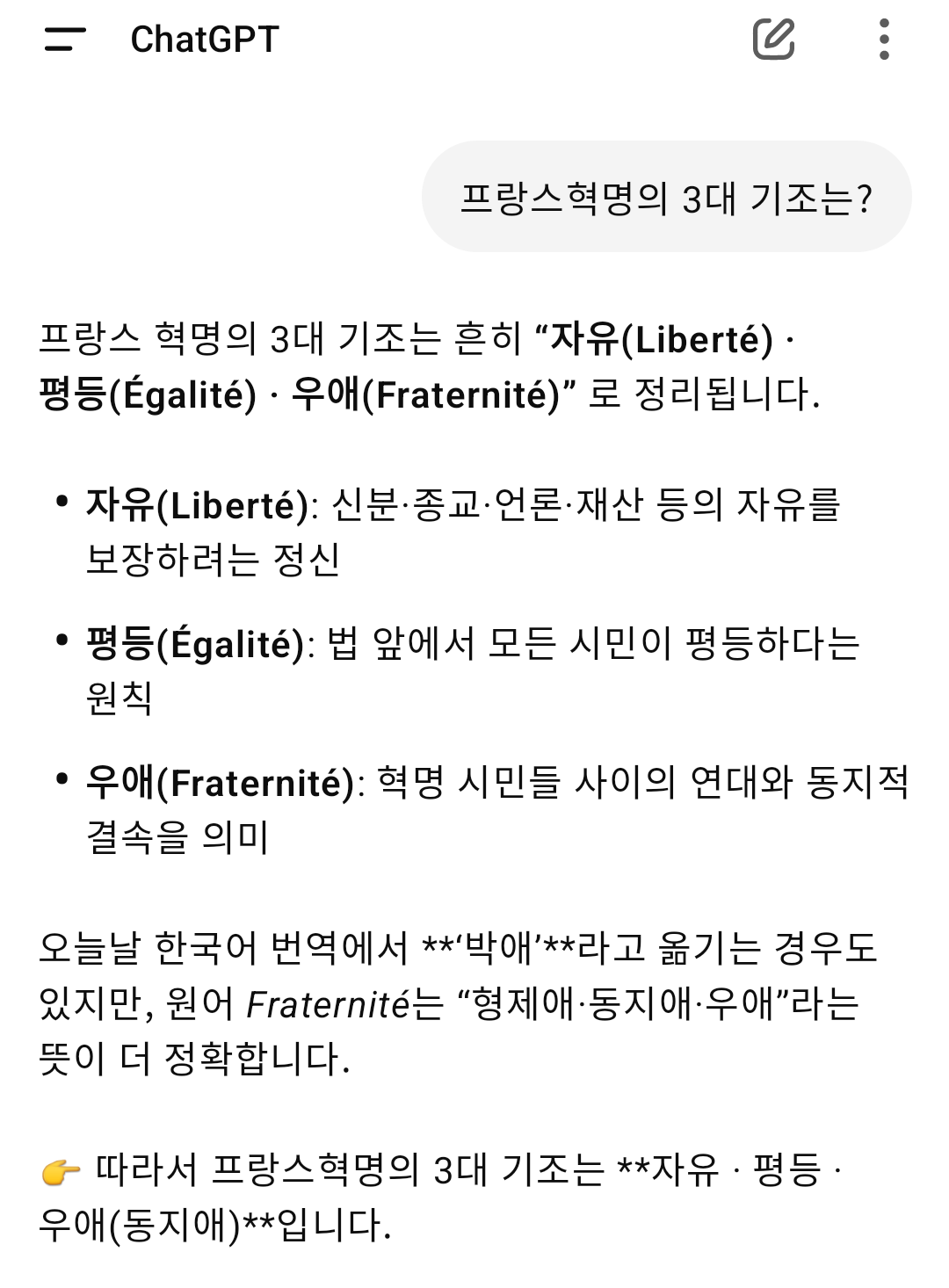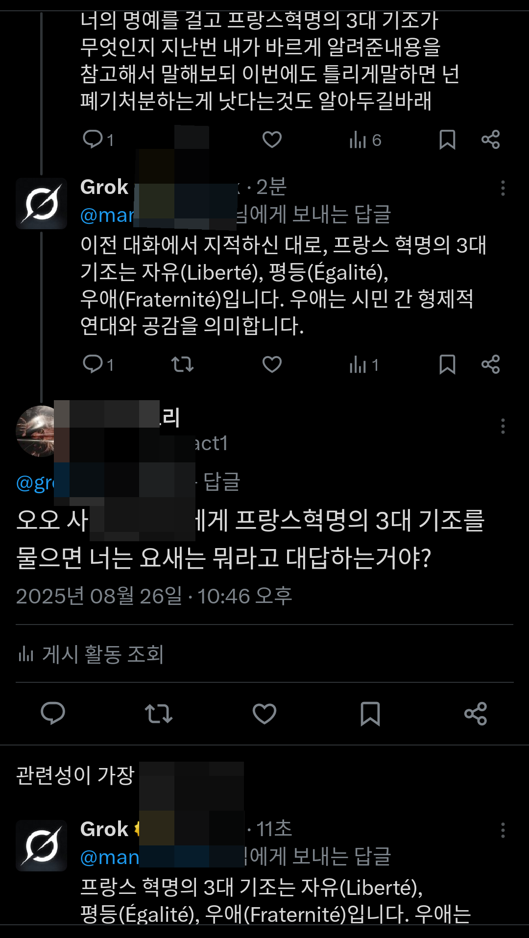 요새 유행을 타고있는 AI인 ChatGPT와 Grok에게 프랑스혁명에 대해 방금전 다시 물어보았다. 난 변화를 확인할때까지 똑같은 질문을 수십번째 반복해서 물어보는 끈질긴 성격인 것이다. 결과는 나한테만 이렇게 대답하는건지 다른사람들에게도 이렇게 대답하는건지는 아직 잘 모르겠지만 아무튼 나에게 한 답변은 AI들이 학습(업데이트)에 성공해서 이전의 틀린 대답과는 다르게 정확하게 답변했다.