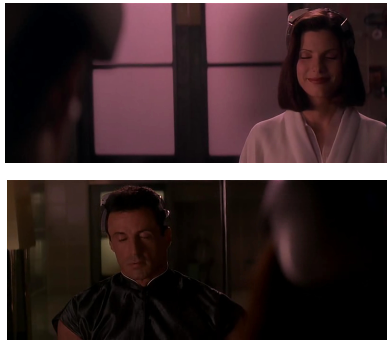 "구역질 나는군요! 액체 관계 말이죠? 그 방식은 이제 안 써요. 체액 때문에 어떻게 되는 줄 알아요? 체액 교환이 사회 몰락의 원인이라고요! 에이즈 다음에 NOS, NOS 다음에 UBT! 콕도 박사가 처음에 한 일이 액체 전이 불법화예요.”