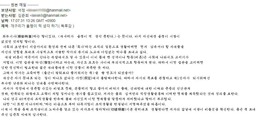 이제 이 책을 통해 조직살이의 노하우를 알고 있는 저자로서 절차탁마(切磋琢磨) 기본 원리대로 생활한다면 저자의 앞날에 서광이 비출 것을 확신한다. 좋은 책 보내주신 김준희 씨에게 감사한다.