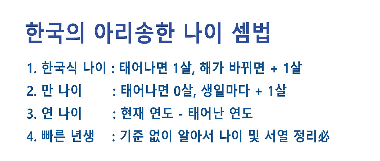 고로, 대한민국 국민의 나이 계산법이 세상에서 가장 복잡하다고 할 수 있다. 그 때문에 일상생활에서도 머리를 잘 굴려서 나이를 따져야 하는 순간이 왕왕 발생한다. '잠깐만, 내가 몇 살이지?'라는 생각을 할 때도 있다.띠는 음력으로 따지면서 나이는 1월 1일이 기준인 참으로 아리송한 나이 문화 때문이다.