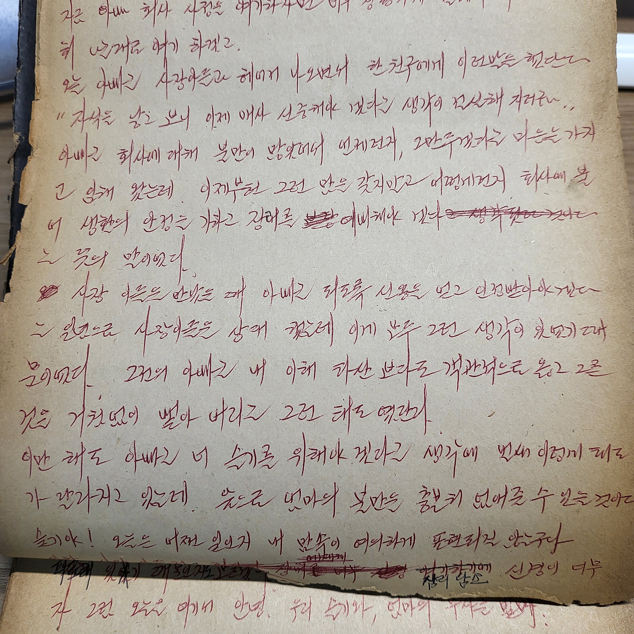 (중략) 아빠는 아까 12시가 넘도록 뭘 했는가? 했는데 우리 회사 사장 아들을 만나 술을 먹느라고 그렇게 늦었단다. 혹시 네게 더 돈이 필요하게 될지 몰라 50,000원을 가불 했는데 그걸 찾으려고 본사에 갔더니 사장 아들이 아빠를 기다리고 있었던 거다. 지금 아빠 회사 사정을 얘기하자면 너무 장황하게 될 테라 다음 기회 나는 대로 얘기하겠고. 오늘 아빠는 사장 아들과 헤어져 나오면서 한 친구에게 이런 말을 했단다.