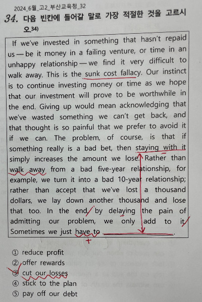 지문을 요약하면, "우리는 무언가를 낭비했다는 것을 인정하는 생각이 너무 고통스러워 피하고 싶어 합니다. 때문에 나쁜 5년짜리 관계에서 벗어나지 않고 그것을 나쁜 10년짜리 관계로 만들고, 천 달러를 잃었다는 것을 받아들이지 않고 또 다른 천 달러를 투자하고 그것마저 잃고 맙니다. 때문에 우리는 때때로 손해를 감수해야 합니다"라는 내용입니다.