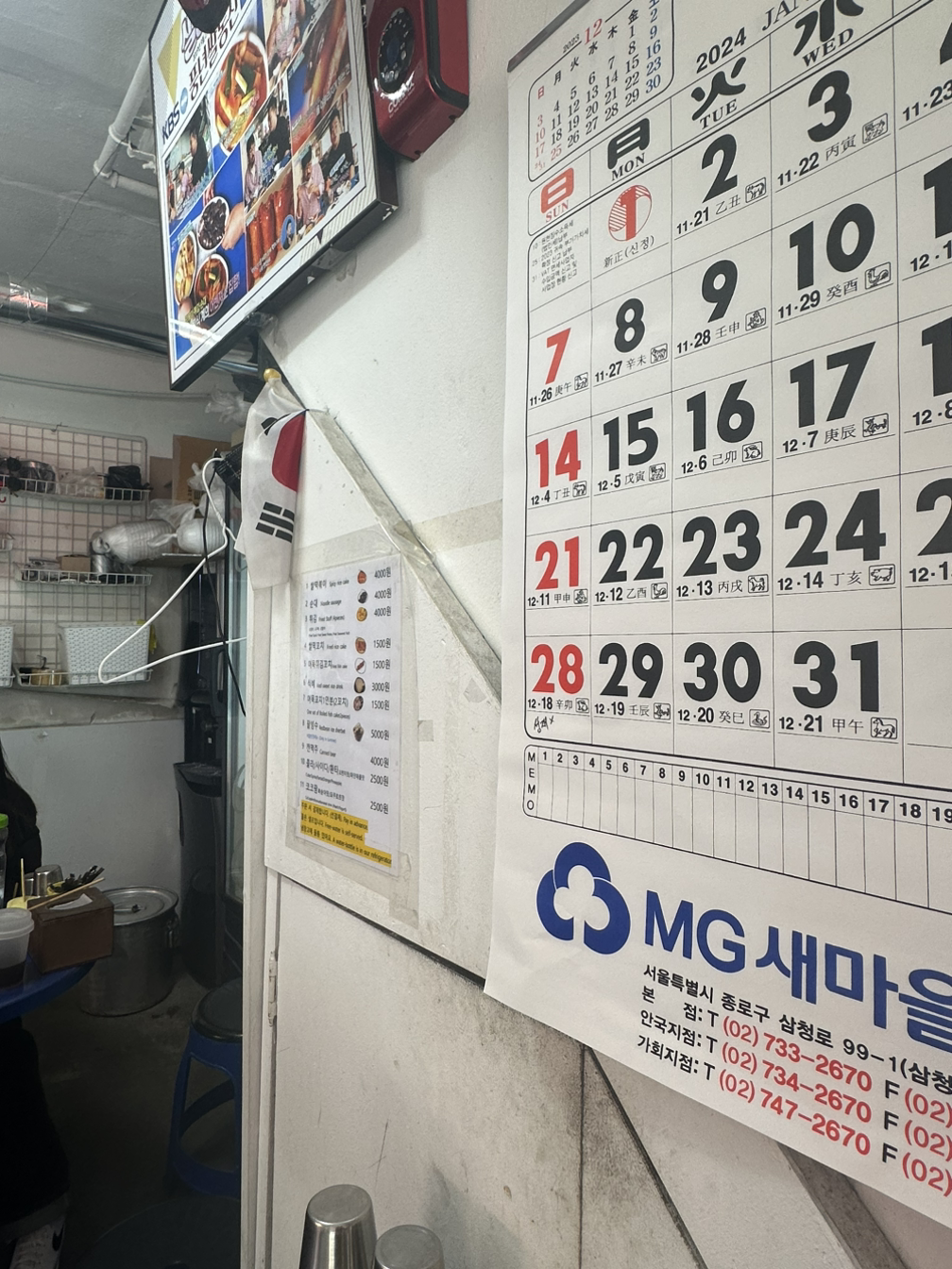 혼밥에 아주 익숙한 나지만 분식집은 도전해보지 못해서- 쭈뼛쭈뼛 한명이요, 하며 들어서는데 순식간에 과거로 시간 여행을 한 듯 했다. 플라스틱 의자며, 뽀글머리를 하고 떡볶이 색이랑 똑같은 두건을 써 누가 누군지 구분 못하겠는 아주머니 두 분, 벽에 걸린 옛날식 달력. 이 모든게 15년 전으로 시간을 돌려버리는 마법을 부렸다.