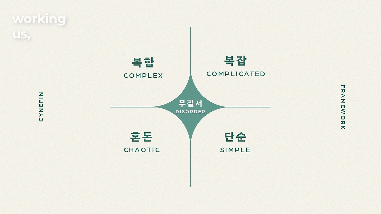 Cynefin 프레임워크에 따르면 비즈니스는 총 5가지 영역 중 한 가지에 속한다고 합니다. 복합 영역, 복잡 영역, 단순 영역, 혼돈 영역 그리고 무질서 영역. 이 중 복합 영역에 있을 때, 애자일과 스크럼 방식으로 일 하기에 가장 좋습니다. 예를 들어 세계 최초로 선풍기 날개 없는 선풍기를 개발한다면? 이럴 때는 예상치 못한 상황이 계속 발생하기 때문에 끊임없이 새로운 가설을 세우고, 빠르게 실행해서 답을 찾는 애자일과 스크럼이 가장 잘 맞다는 것이죠.