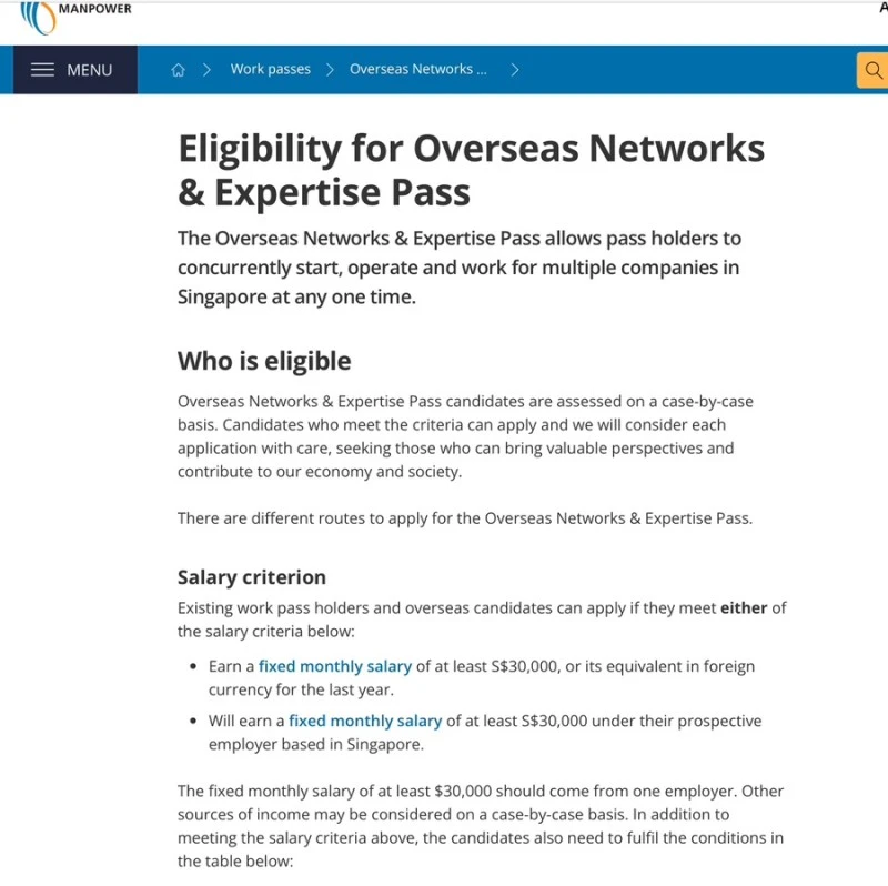 한 회사에서 오직 고정적으로 들어오는 Basic salary + fixed allowance (매달 일정한) = monthly gross salary 가 $30K 이상을 충족해야 한다.
