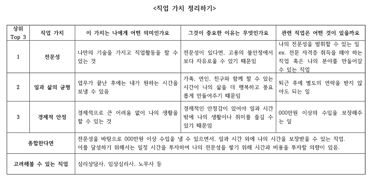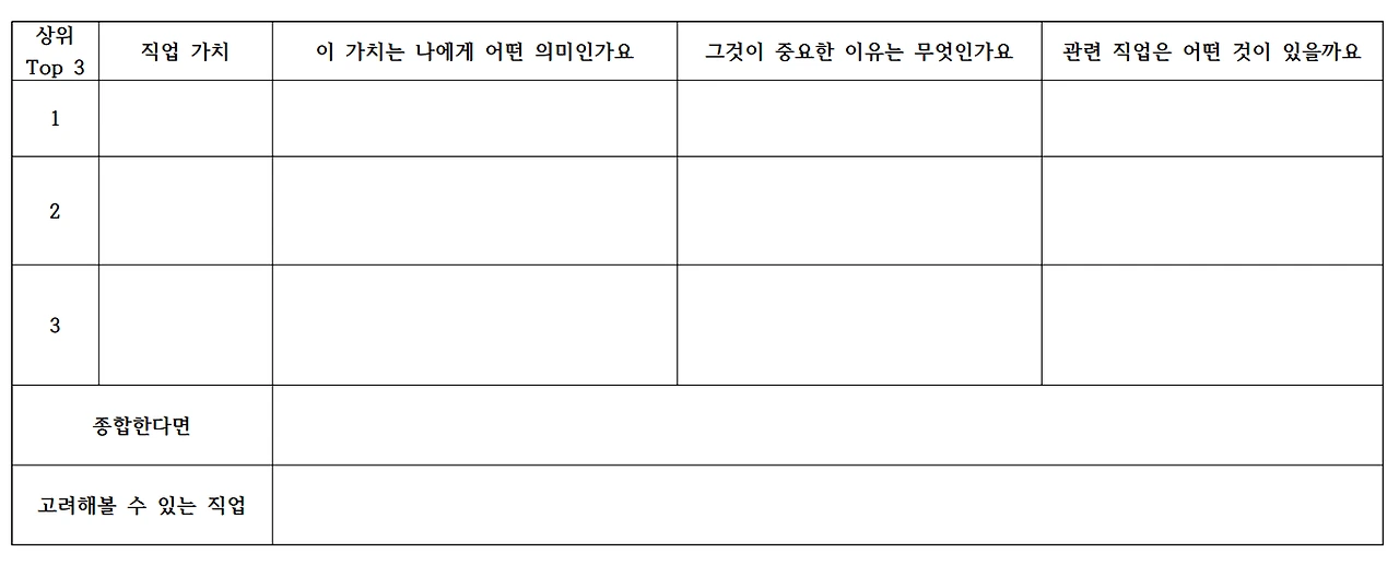 그 밖에 참고할 수 있는 가치의 예시.-> 재미, 창조성, 전문성, 개별성, 소속감, 장래성, 몰입감, 권력, 자아실현, 현실성, 경쟁지향성 등