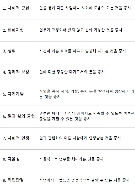 사회적 공헌, 변화지향, 성취, 경제적 보상, 자기개발, 일과 삶의 균형, 사회적 안정, 자율성, 직업안정