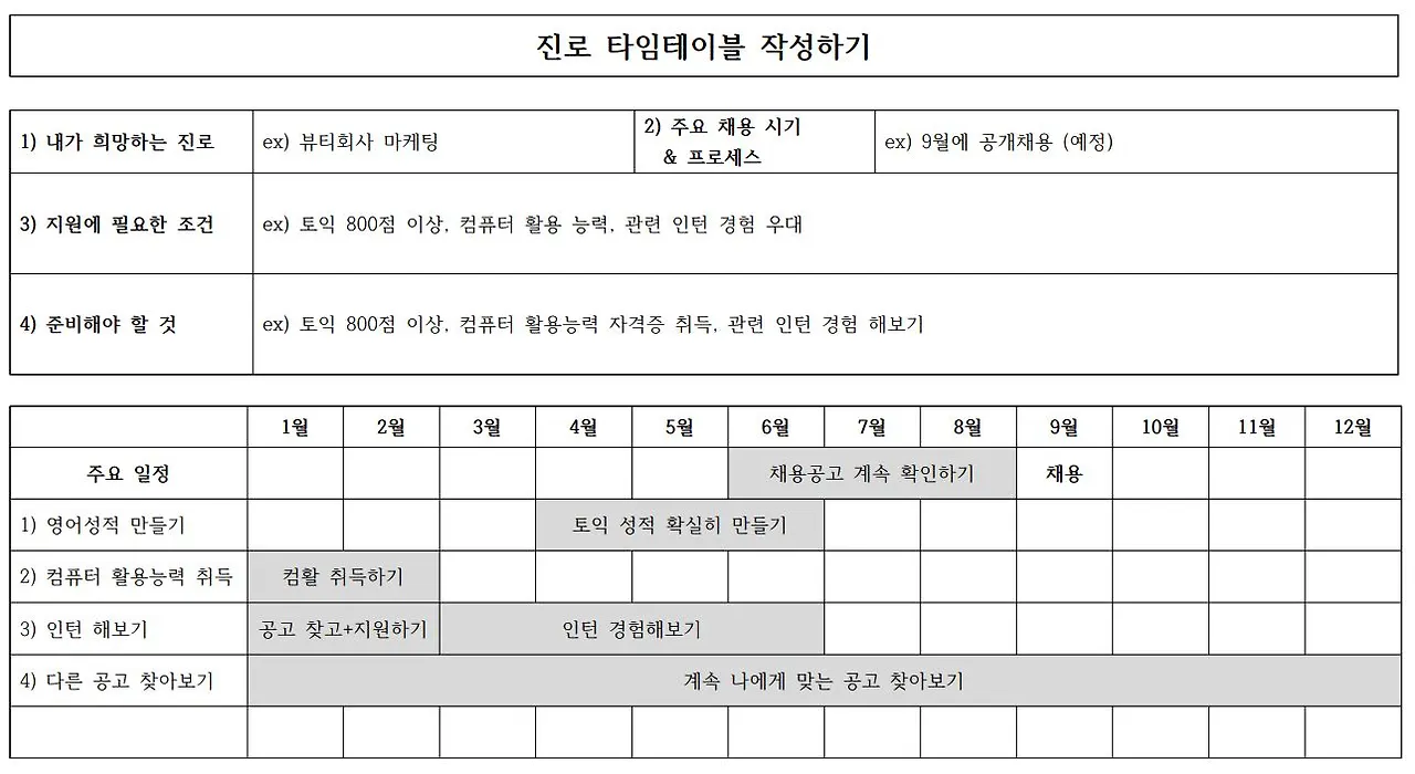 정말 마지막으로 해볼 작업은 진로에 대한 타임테이블을 작성하는 것이다.