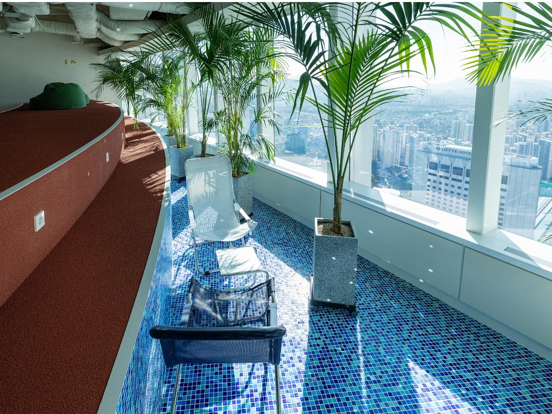 집중이 잘 되는 업무 공간은 물론, 햇볕이 잘 드는 북카페 같은 라운지, 휴양지 펜트하우스 같은 회의실, 바캉스 무드를 즐길 수 있는 수영장 느낌의 공간까지, 그동안 회사에서 찾아볼 수 없었던 신선한 공간들이 풍성하게 마련되어 있었어요. 이런 오피스라면 일을 하면서도 동료들과 함께 즐거움을 누릴 수 있는 곳이라고 느꼈죠.