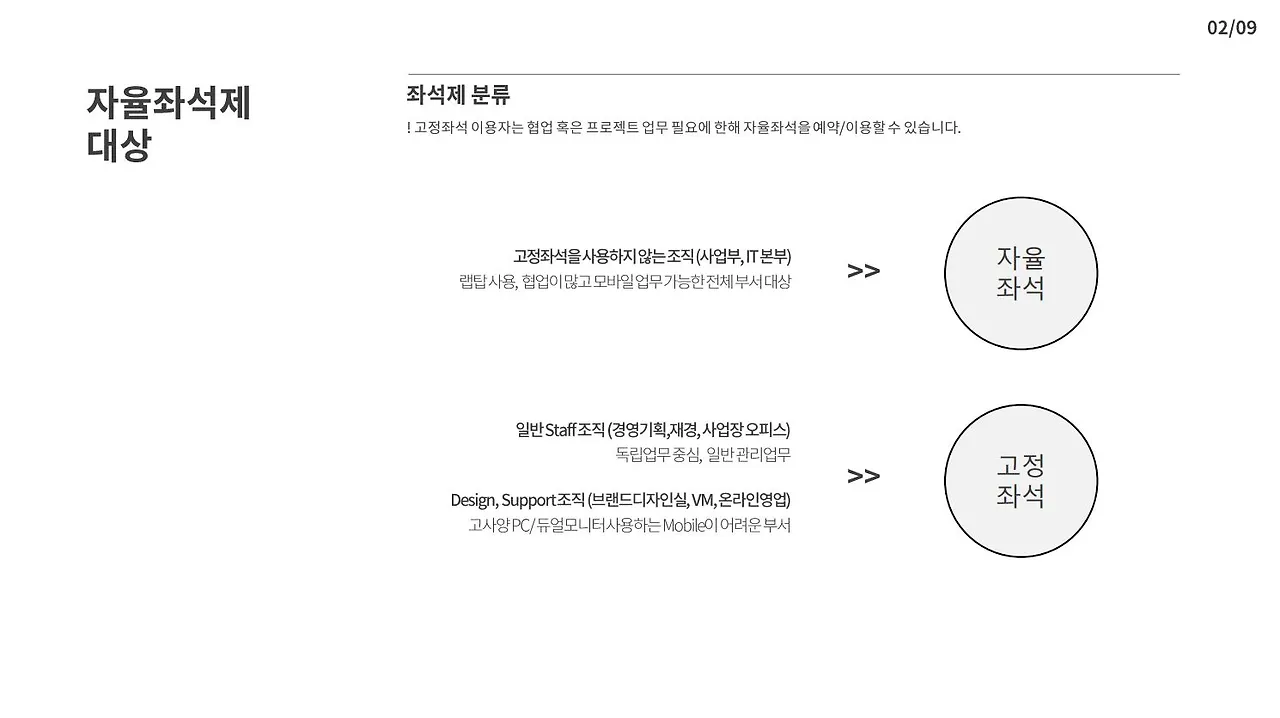 저희는 공정함을 중요하게 여겼어요. 모두가 똑같은 환경을 사용하는 것이 아니니 나중에 불만이 나올 수 있거든요. 그래서 우리가 이걸 왜 하는지, 자율좌석제를 예로 든다면 누구는 도입 하고 누구는 안하는지 그런 기준을 객관적으로 명확하게 정의했어요. 입주 전에 이런 것을 확실하게 정해둔다면 나중에 논란이 생겨도 기준을 설명하고 합리적으로 해결할 수 있으니까요.